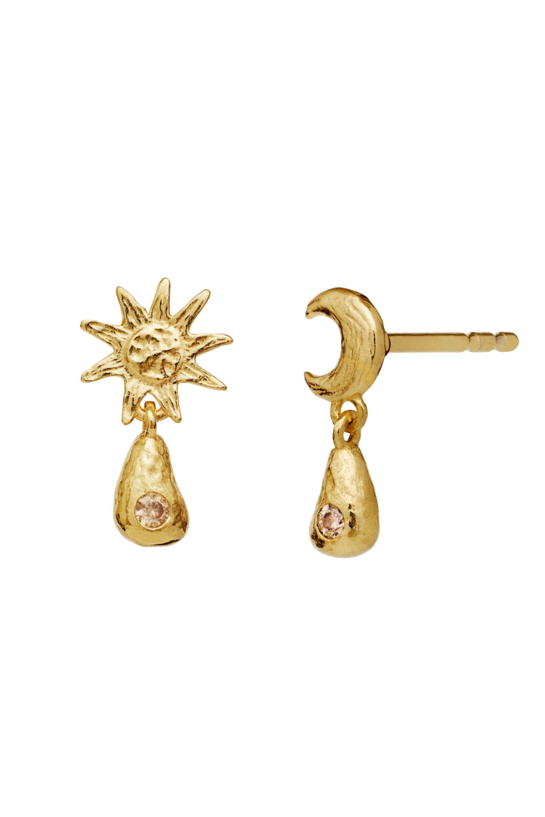 Kultaiset korvakorut Maanestenilta auringon ja kuun kuvioilla. Tipan muotoiset riipukset sisältävät jokaisessa pienen jalokiven ja ne on valmistettu kierrätetystä sterlinghopeasta kultapinnoitteella.