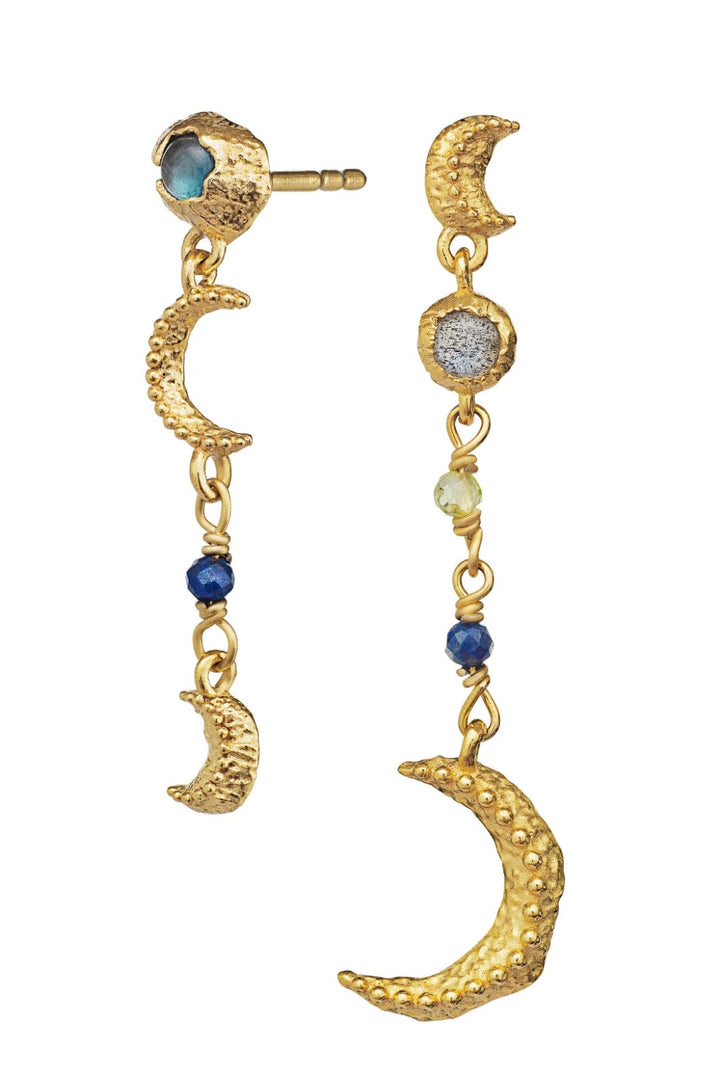 Kultapinnoitetut korvakorut Maanestenilta, joissa on puolikuun muotoja ja värillisiä jalokiviä. Ne on valmistettu kierrätetystä sterlinghopeasta ja niissä on kevyt rakenne.
