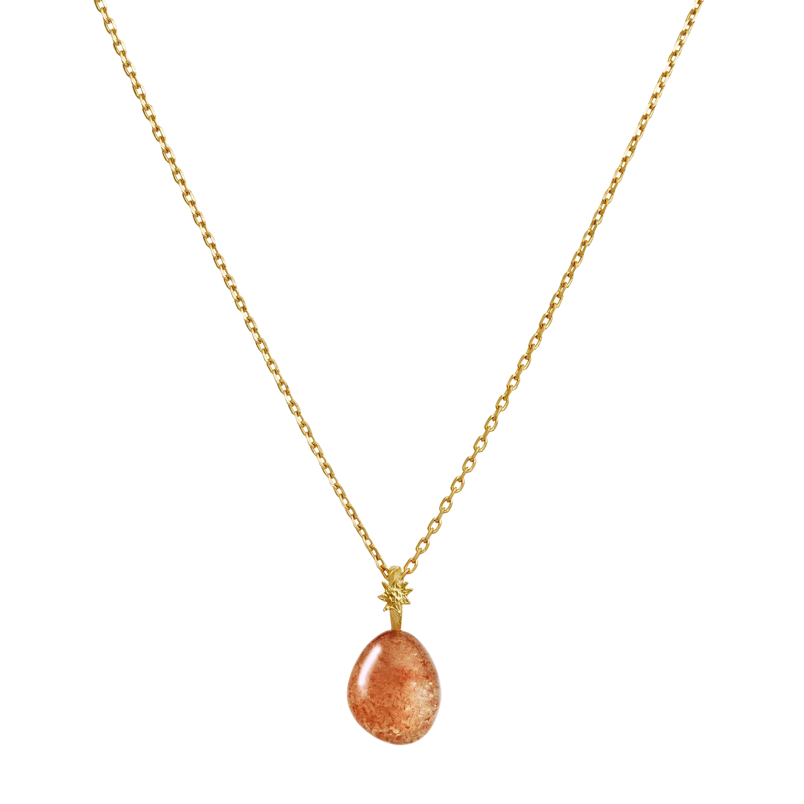 Maanesten-riipus, jossa on pisaranmuotoinen oranssi kivi ja tähtimäinen yksityiskohta yläosassa. Valmistettu kierrätetystä sterlinghopeasta, joka on päällystetty kullalla.