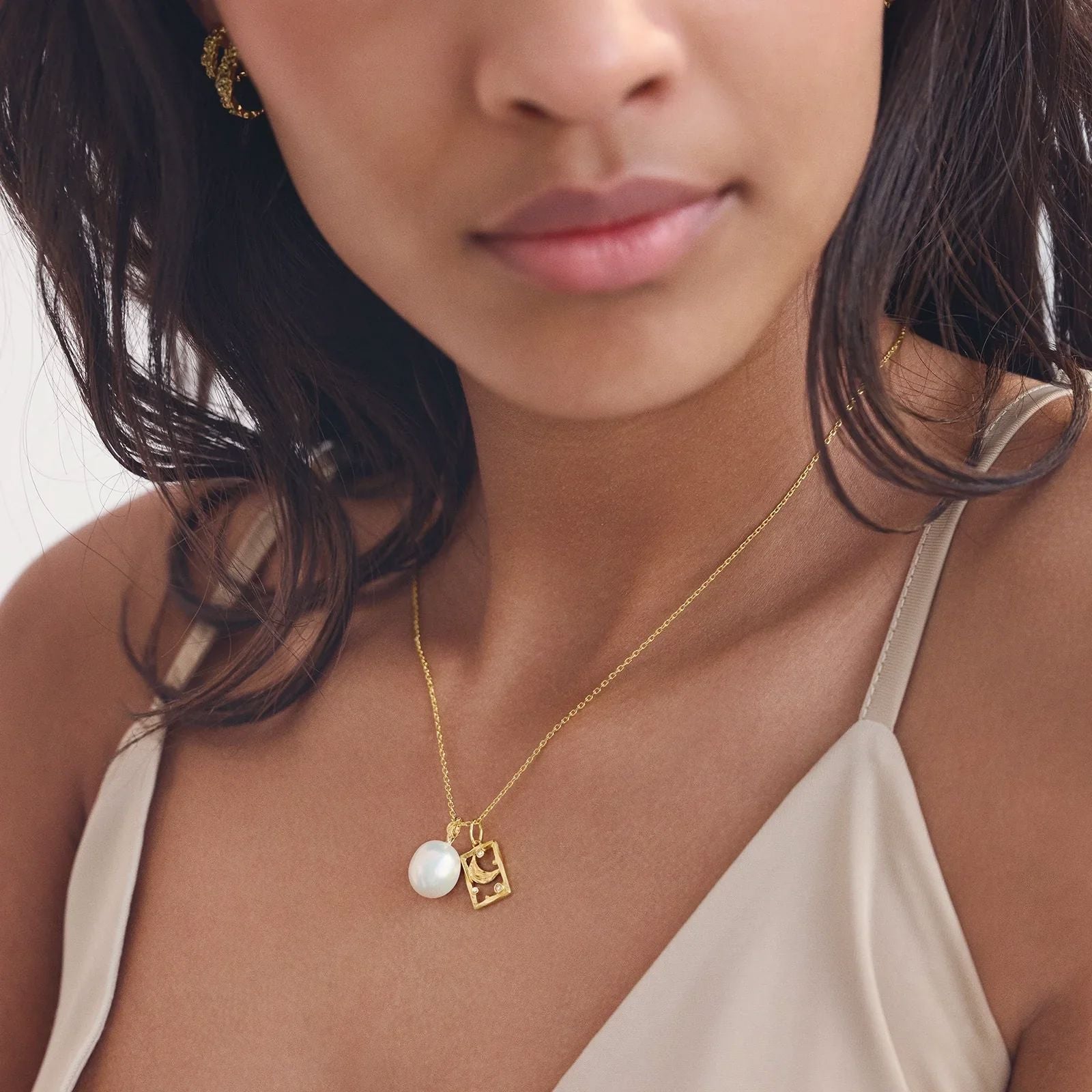 Maanesten-riipus, jossa on suorakulmainen avoin kehys. Muotoilussa on puolikuu ja pieniä pyöreitä kultaisia elementtejä.