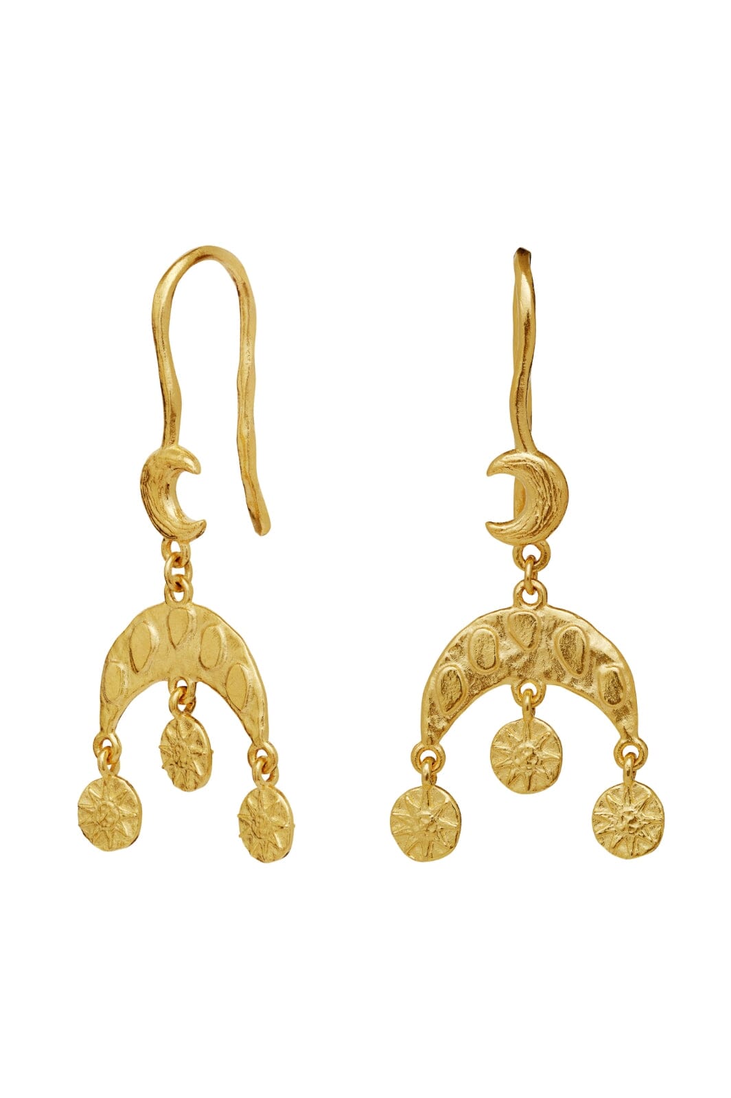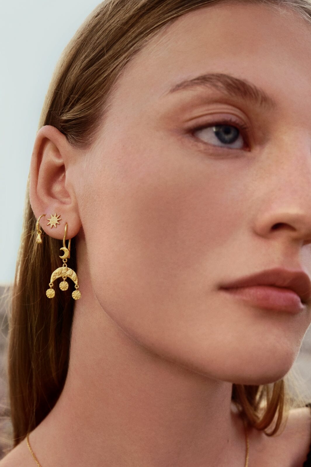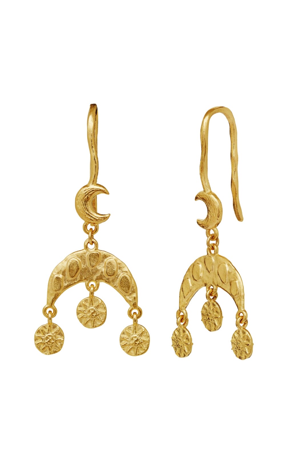 Kultaiset korvakorut Maanestenilta, joissa on puolikuun muotoinen yläosa ja roikkuvat pyöreät levyt. Korvakoruissa on taivaallisia motiiveja ja liikkuvia elementtejä.