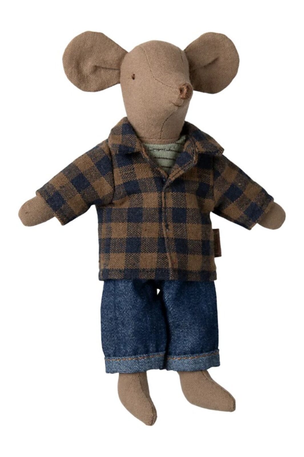 Vaaleanruskea hiiri Mailegilta, jolla on suuret korvat ja yksinkertaiset kasvonpiirteet. Hiirellä on ruudullinen paita, tanktoppi ja käännetyt farkut.