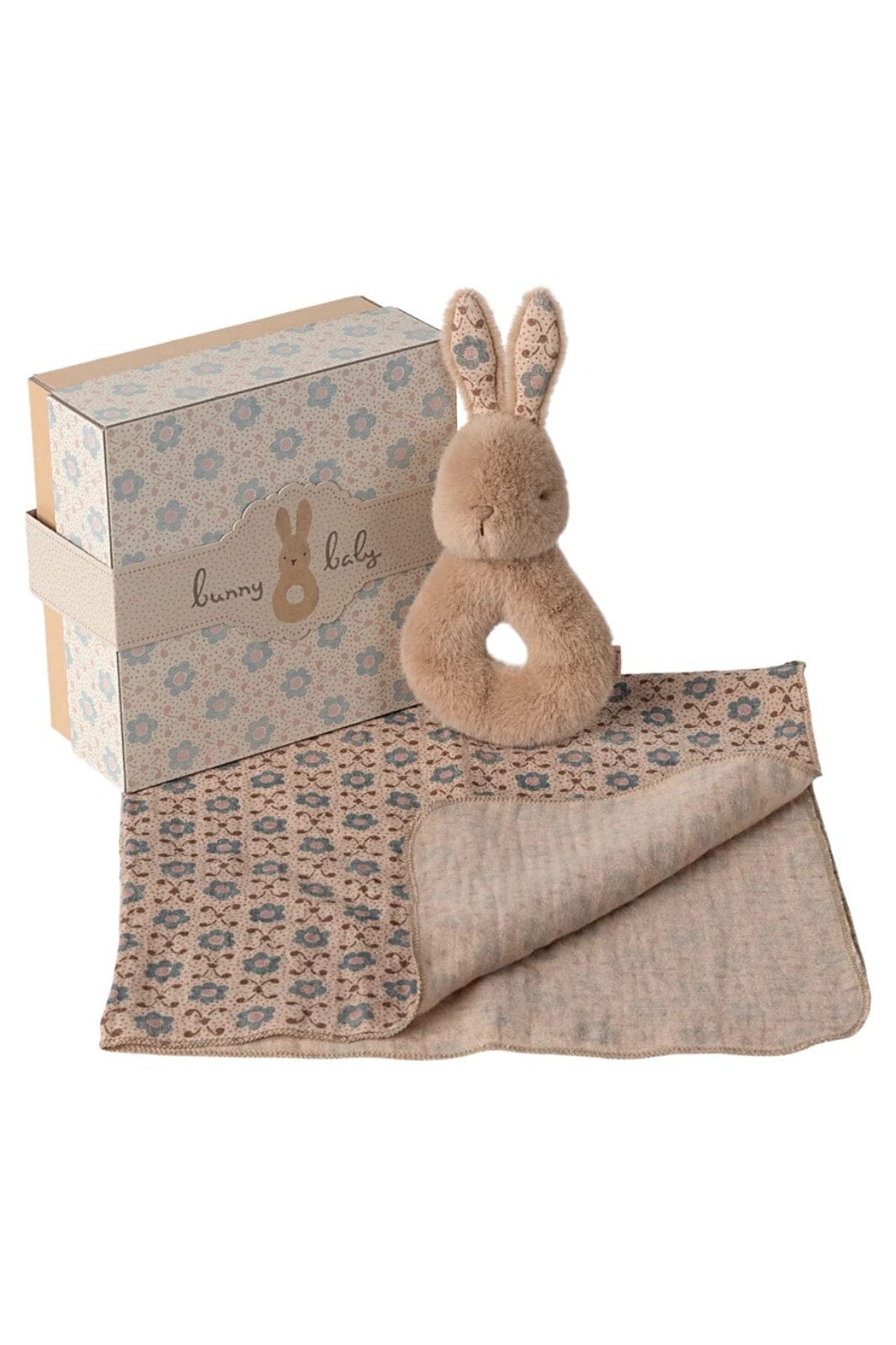 Pehmeä kanin rattles vaaleassa persikassa Mailegilta. Rattles tulee koristeellisessa lahjalaatikossa ja siinä on kukkakuosiset korvat, joissa on sisäinen rapiseva ääni.