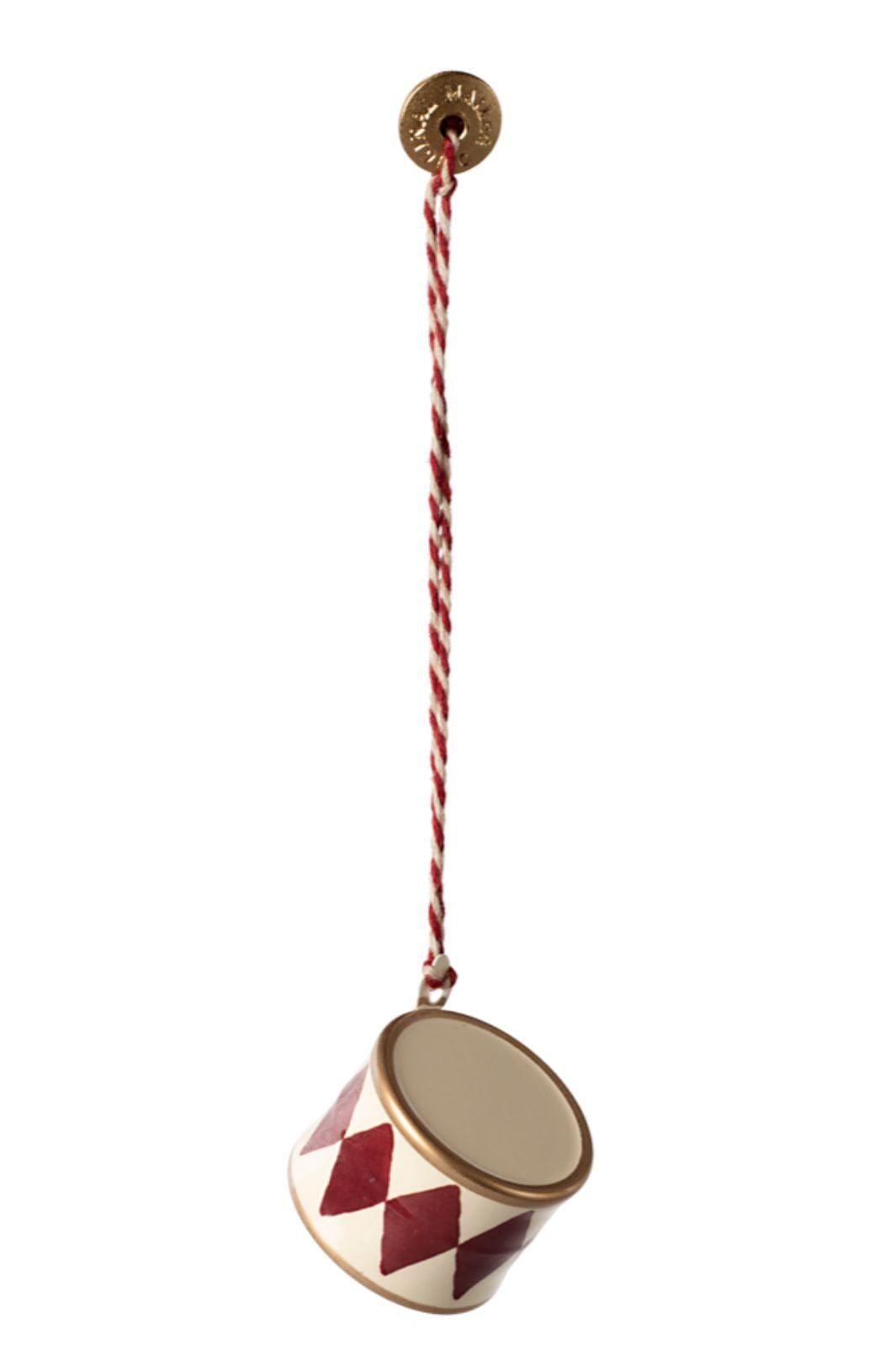 Pieni rumpumuotoinen metalliriipus Mailegilta, punavalkoisella timanttikuvioinnilla. Valmistettu metallista, käsinmaalatuilla yksityiskohdilla ja kierretyllä ripustusnarulla.