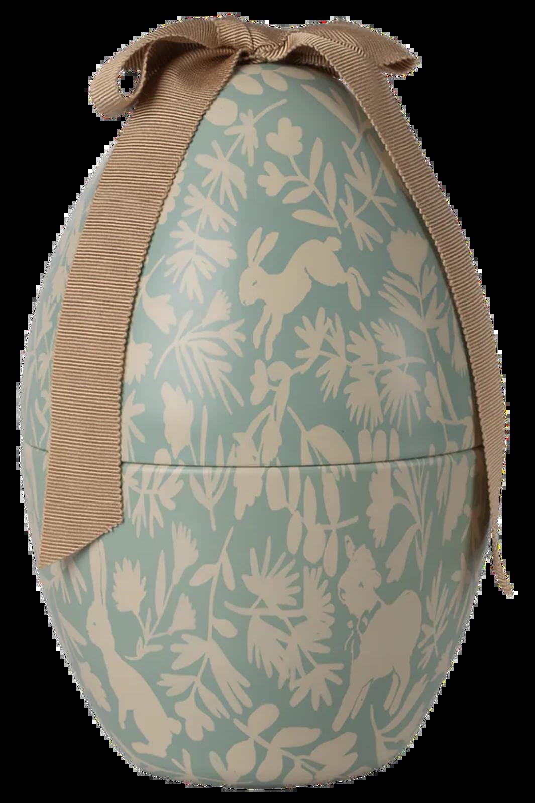 Keskikokoinen pääsiäismuna Mailegilta vaaleansinisestä metallista, jossa on pupujen ja kasvien kuvio. Munan päällä on ruskea rusetti.