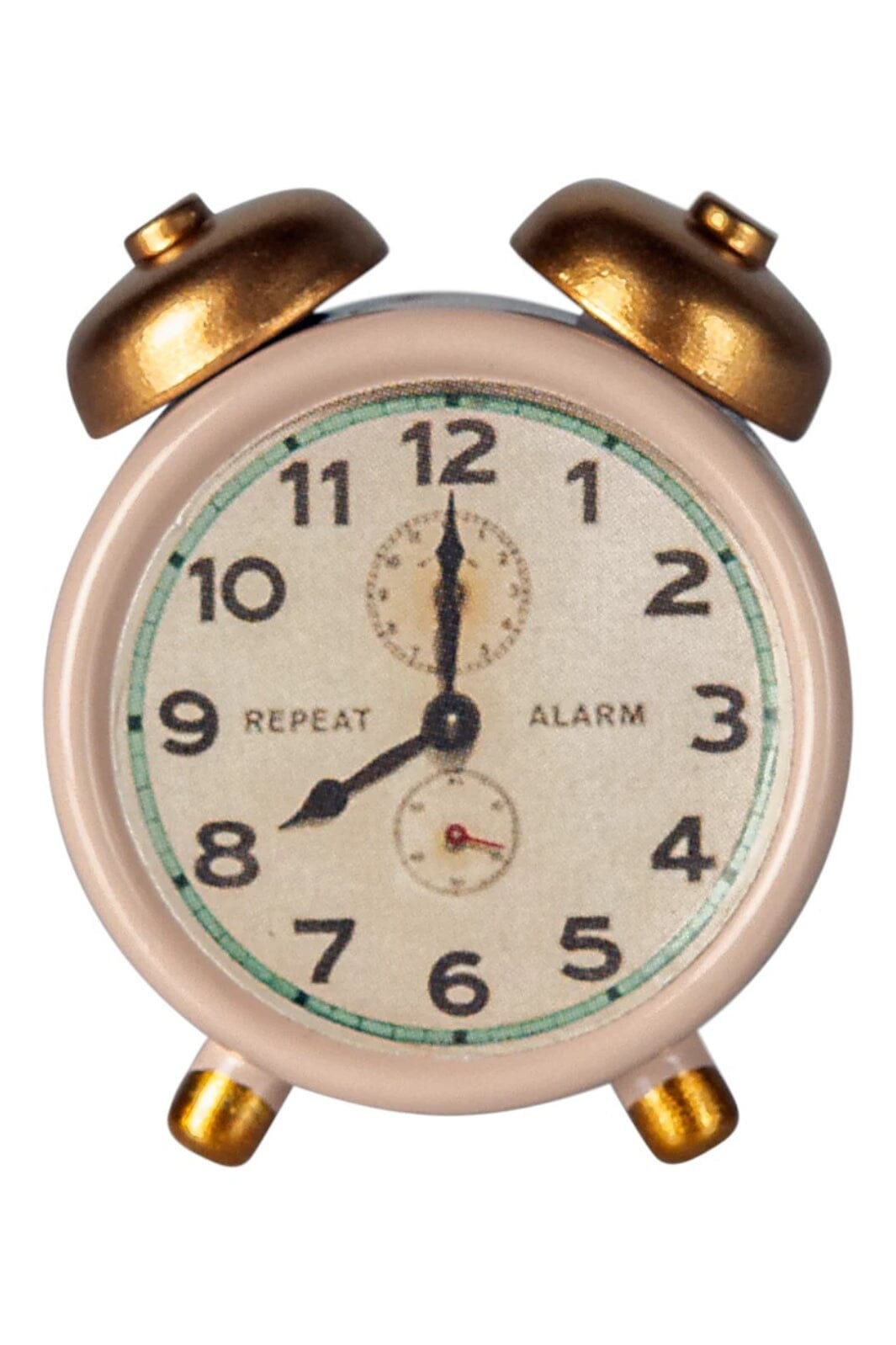 Mailegin herätyskello vaaleanpunaisena kultaisilla yksityiskohdilla. Kellolla on klassinen muoto, jossa on kaksi kelloa päällä ja selkeä kellotaulu numeroilla ja hälytysfunktiolla.