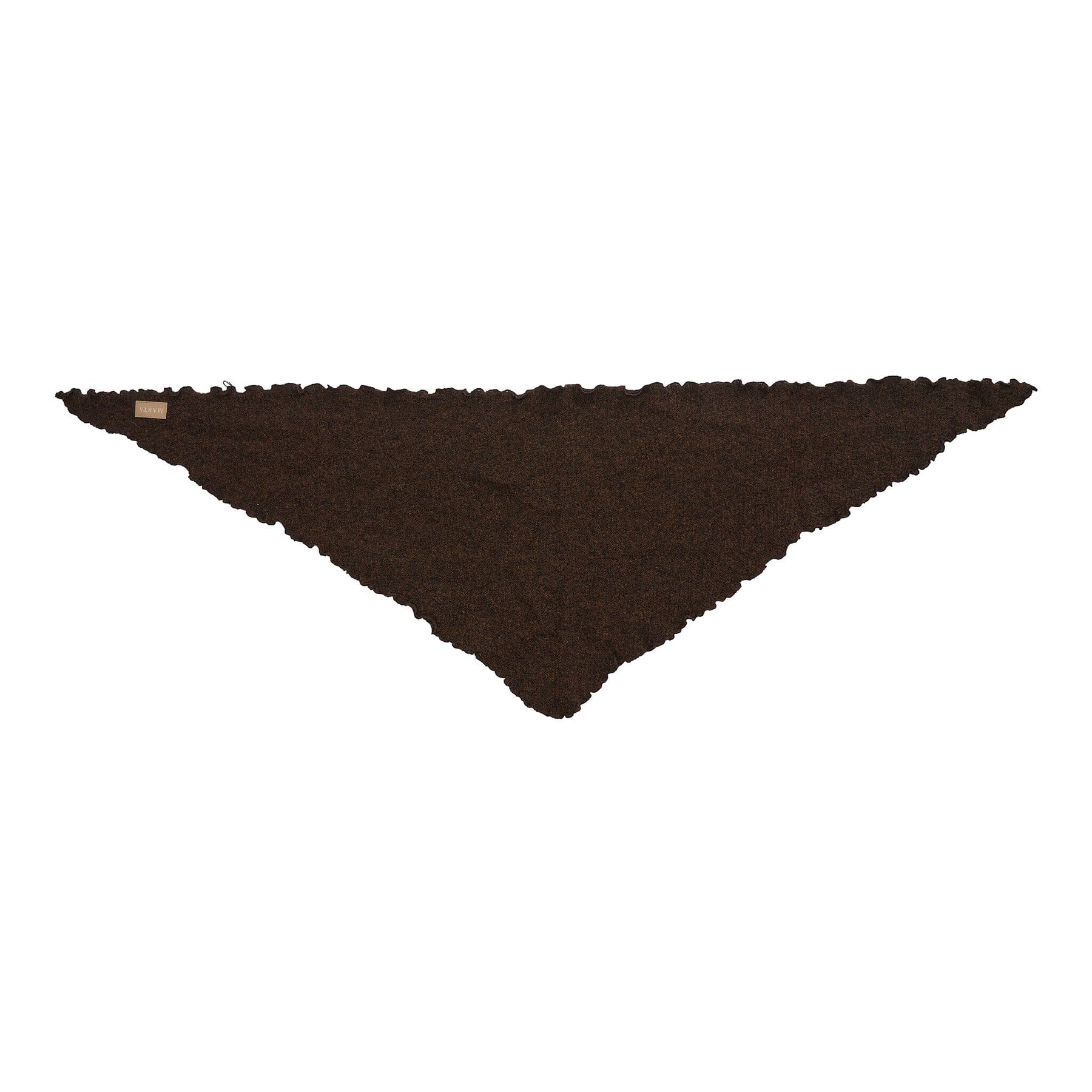 Ruskea huivi Marta Du Chateau -merkkiltä, jossa on hapsureuna ja melange-ilme. Kultasävyinen brändilogo ja pehmeä akryyli antavat huiville viimeistellyn ilmeen.