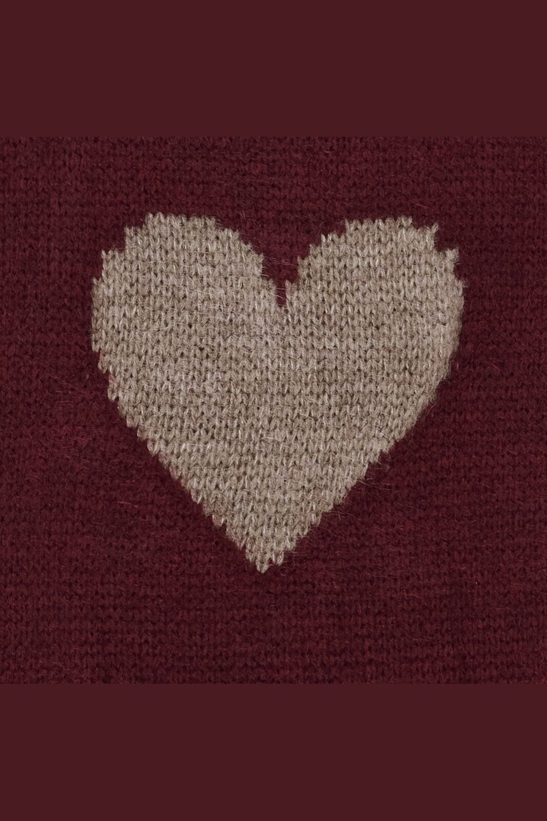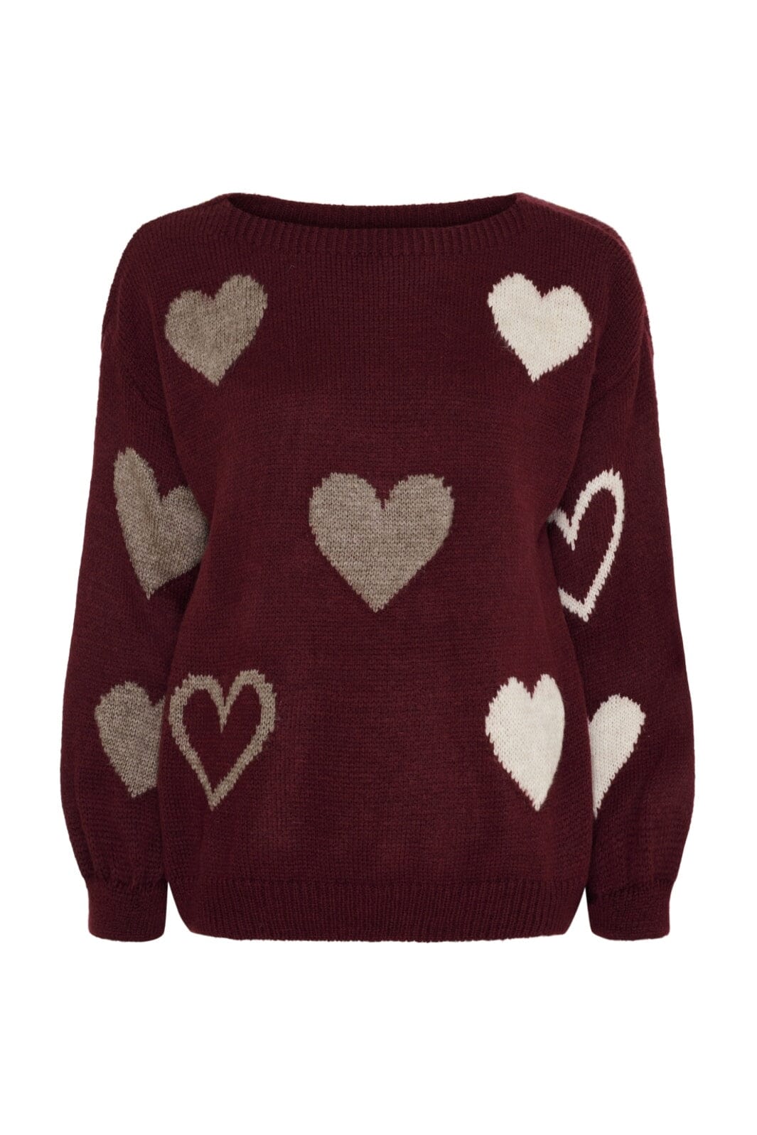 Viininpunainen neule Marta Du Chateau -merkiltä, jossa on sydämen muotoisia kuvioita eri sävyissä. Neuleessa on pyöreä kaula-aukko ja pitkät hihat.