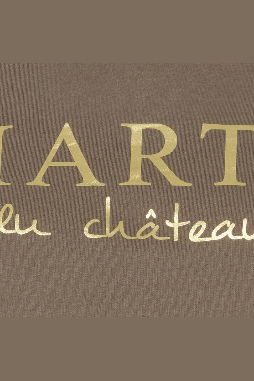 Huppari Marta Du Chateau -merkkiltä maanläheisessä fango-sävyssä. Siinä on kultainen logo-printti edessä ja rento malli, joka tekee siitä helpon yhdistää erilaisiin asusteisiin.