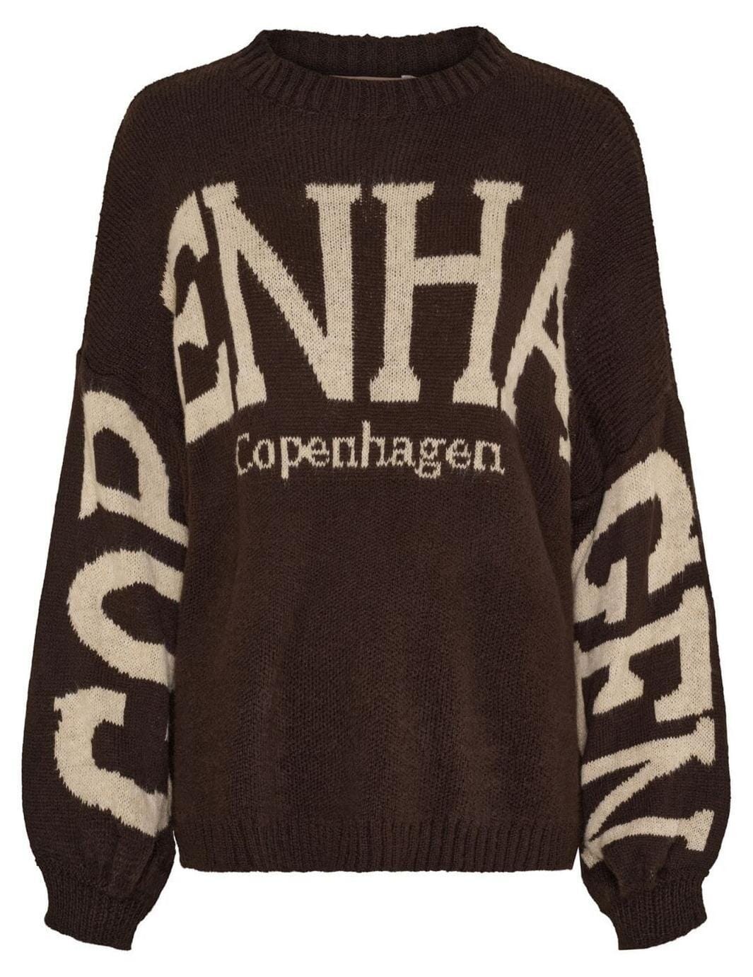 Tummanruskea neule Marta Du Chateau -merkkiltä, jossa on painettu tekstimuotoilu beigen värillä. Neuleessa on oversized-muotoilu ja pyöreä kaula-aukko.