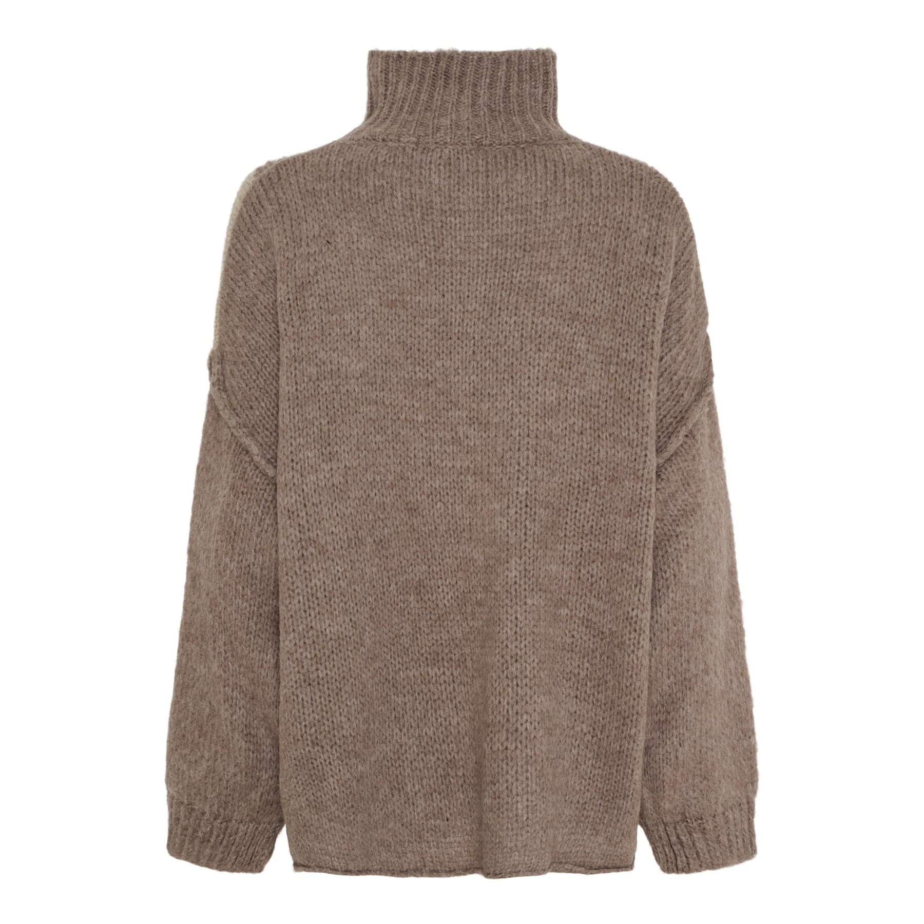 Neulottu pusero Marta Du Chateau -merkkiltä, jossa on korkea poolokaulus ja ruudullinen kuvio ruskeissa sävyissä. Puserolla on oversized-mitoitus ja pitkät hihat.