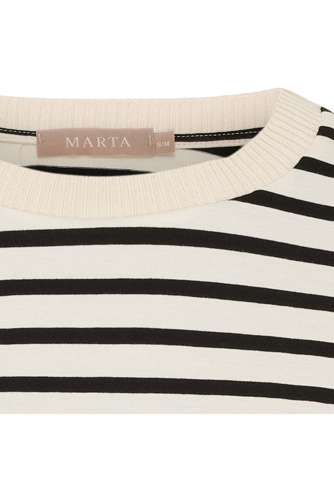 Raidallinen t-paita Marta Du Chateau -merkkiltä, jossa on beigejä ja mustia raitoja. T-paidassa on pyöreä kaula-aukko ja 3/4-hihat, ja se on löysästi istuva.