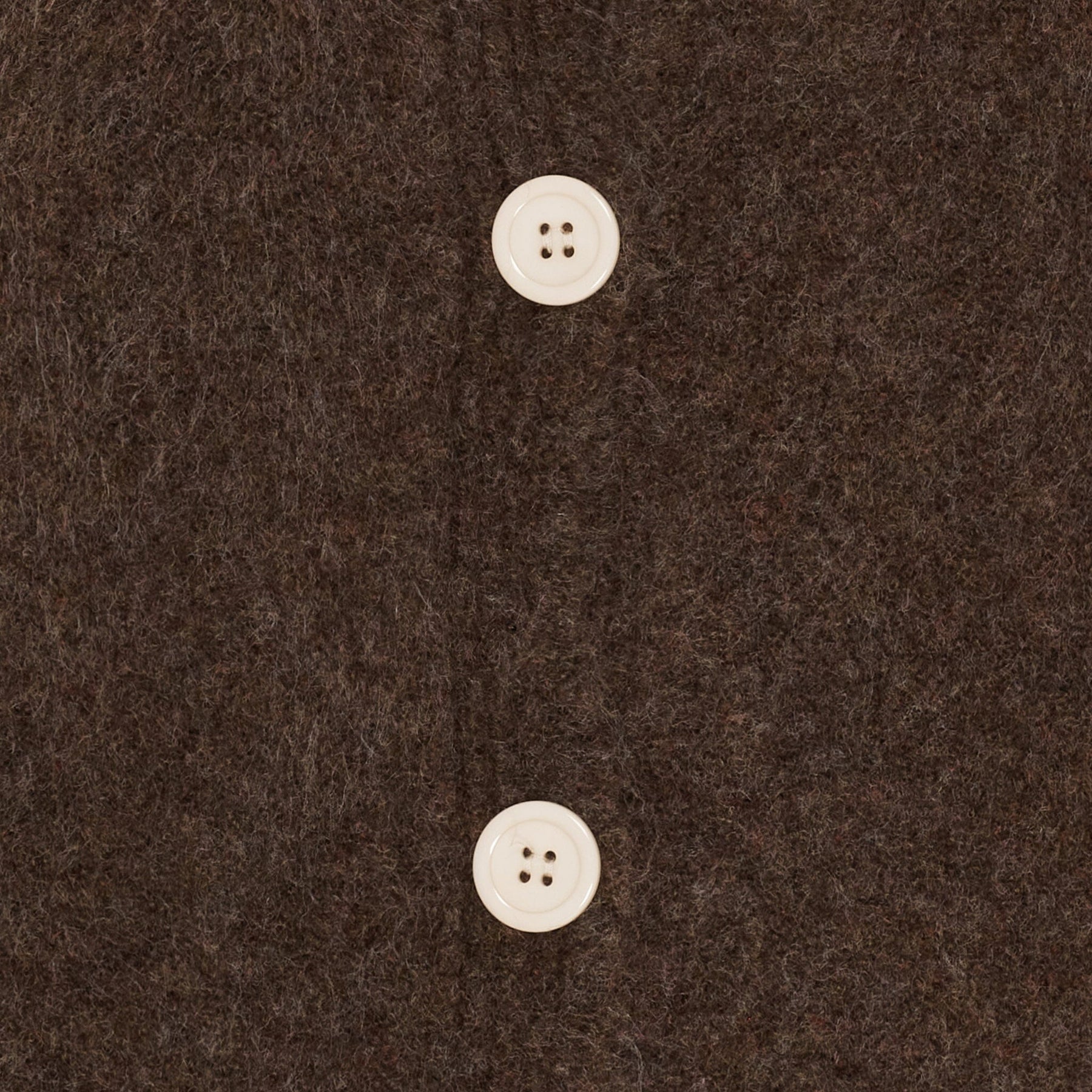 Ruskea neulepaita Marta Du Chateau -merkkiltä, jossa on beige hihansuut ja napit edessä. Pieni sydänkuvio sijaitsee vasemmalla rintapielessä.