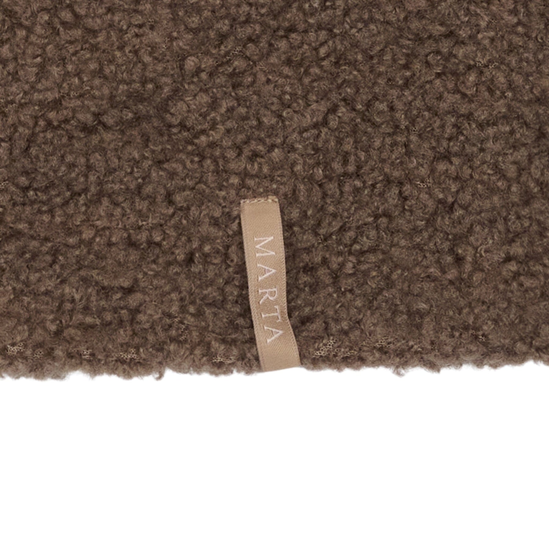 Ruskea balaclava Marta Du Chateau -merkkiltä, jossa on pehmeä teddy-tekstuuri. Se peittää pään ja kaulan avoimella kasvoalueella ja siinä on säädettävät narut edessä.