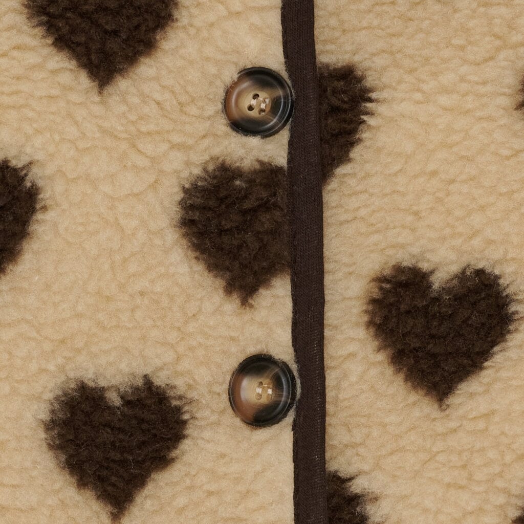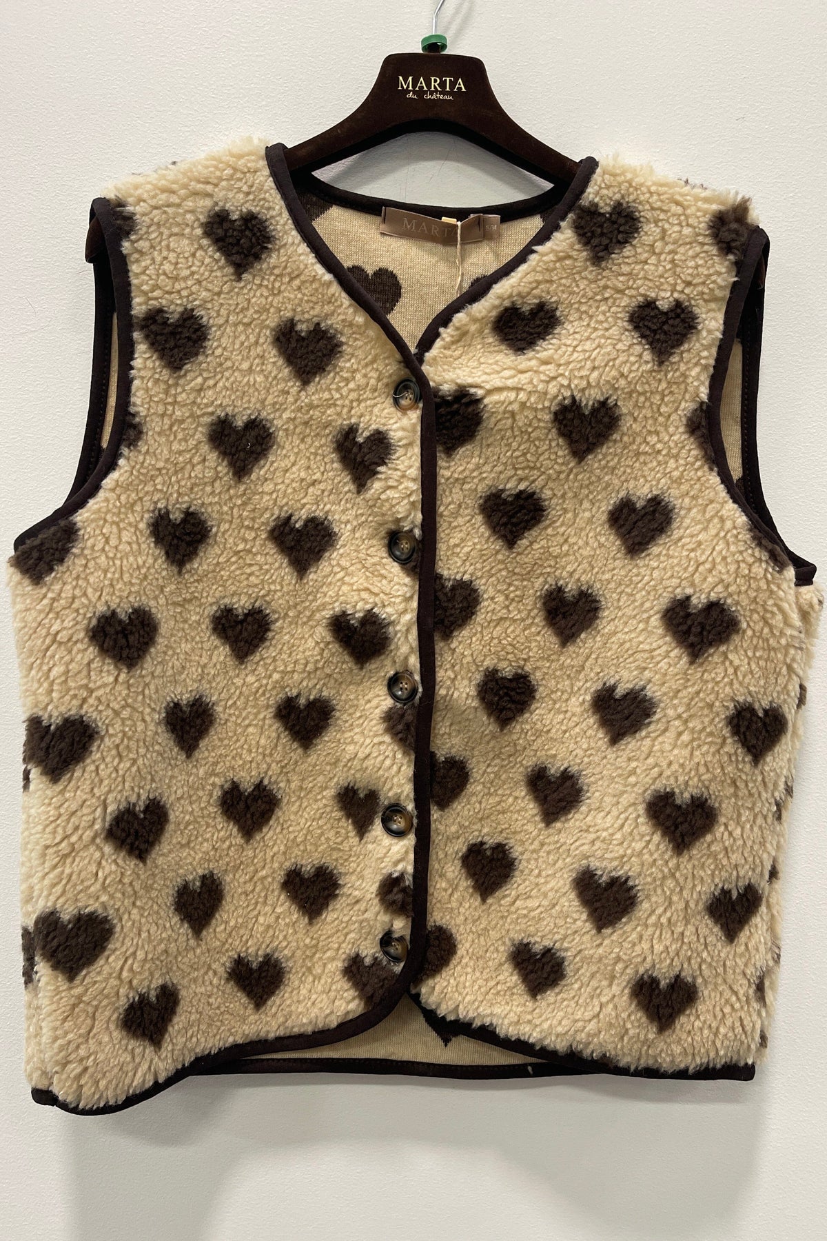 Marta Du Chateau -liivi, jossa on tummien sydänten kuvio vaaleanbeigellä taustalla. Liivissä on tummat reunat ja V-pääntie.