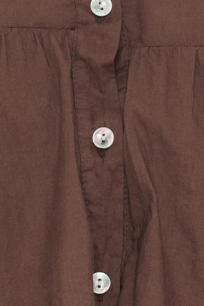 Ruskea pusero Marta Du Chateau -merkkiltä, 100 % puuvillaa. Suunniteltu useilla kerroksilla röyhelöitä ja volangeja edessä. Siinä on suuri istuvuus, pitkät hihat ja rypytettyjä yksityiskohtia.