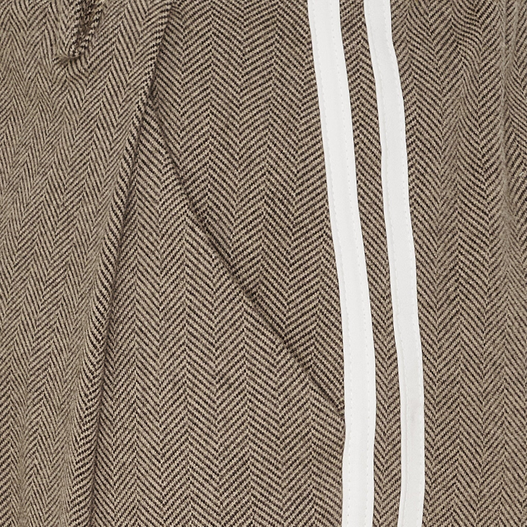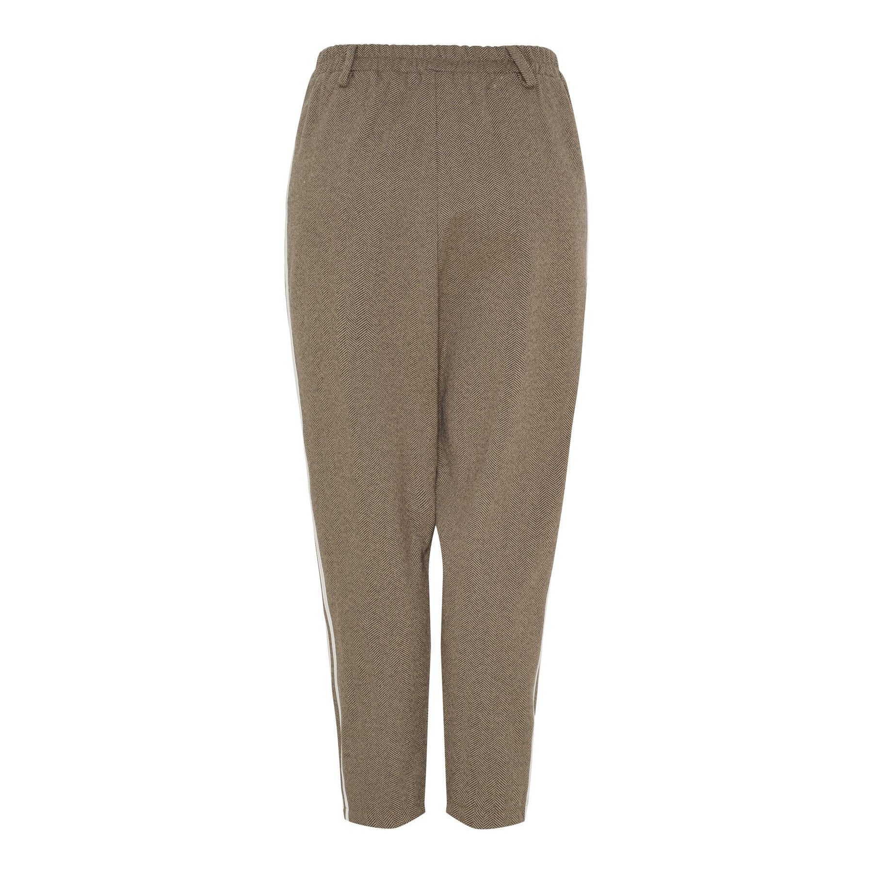 Ruskeat housut Marta Du Chateau -merkkiltä, joissa on valkoiset raidat lahkeissa. Housuissa on löysä istuvuus ja ne ulottuvat puoliväliin sääriä. Niissä on sekä vetoketju, joustovyö että napit vyötäröllä.