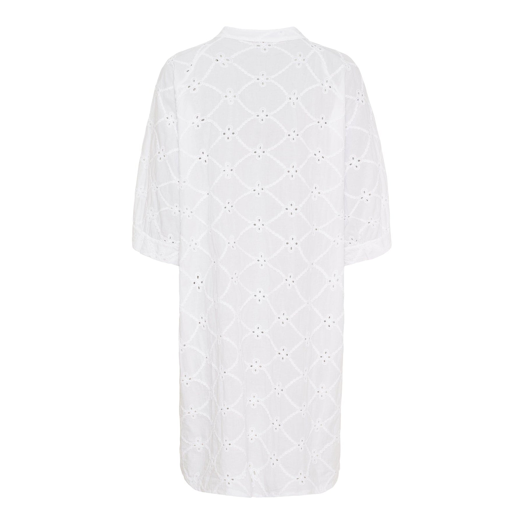 Valkoinen mekko Marta Du Chateau -merkiltä, jossa on brodeerattu kukkakuosi. Mekossa on kauluspaita, 3/4-hihat ja polvipituus. Rentoa istuvuutta tarjoaa hyvää liikkuvuutta.