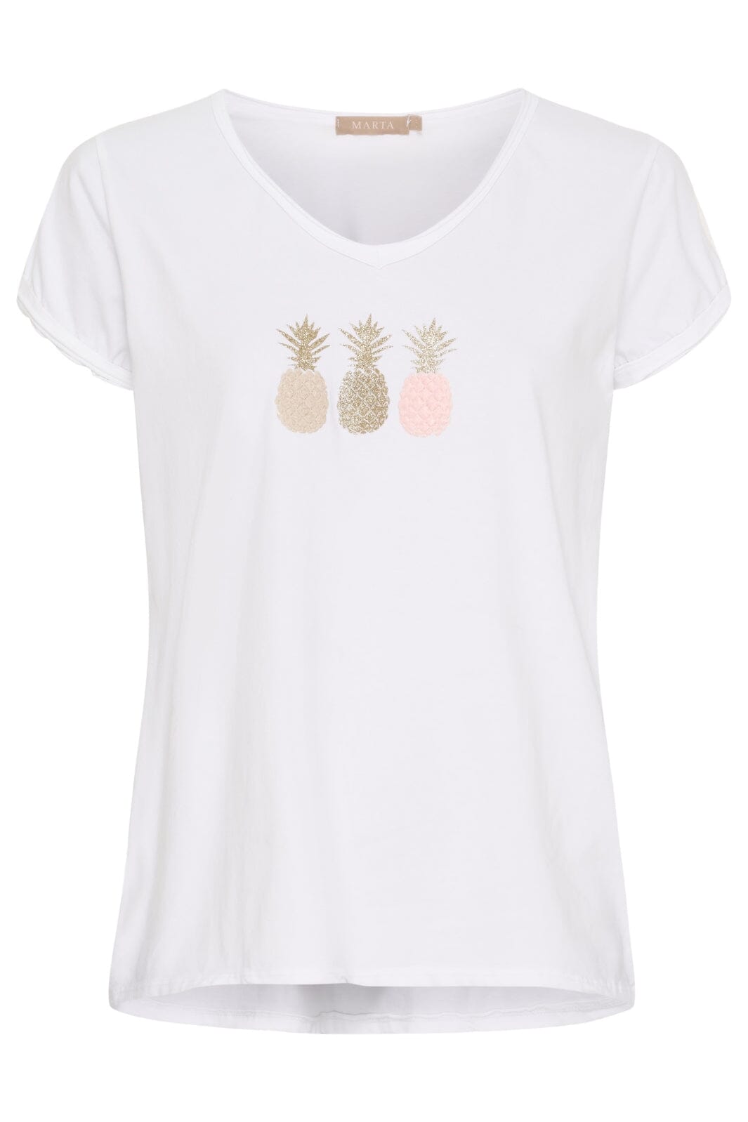 Valkoinen t-paita Marta Du Chateau -merkkiltä, jossa on V-pääntie ja käännetyt hihat. Edessä on kolme kimaltavaa ananasgrafiikkaa kultaisena, beigeenä ja vaaleanpunaisena, jotka antavat t-paidalle kesäisen ilmeen.
