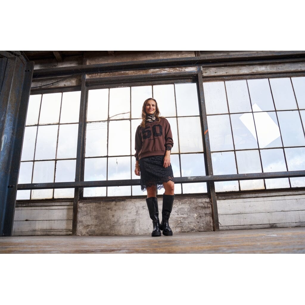 Musta Marta du Château -hame, jossa on pitsikuvio kukallisella designilla. Hameessa on simpukankuoren muotoinen helma ja se on polvipituinen.
