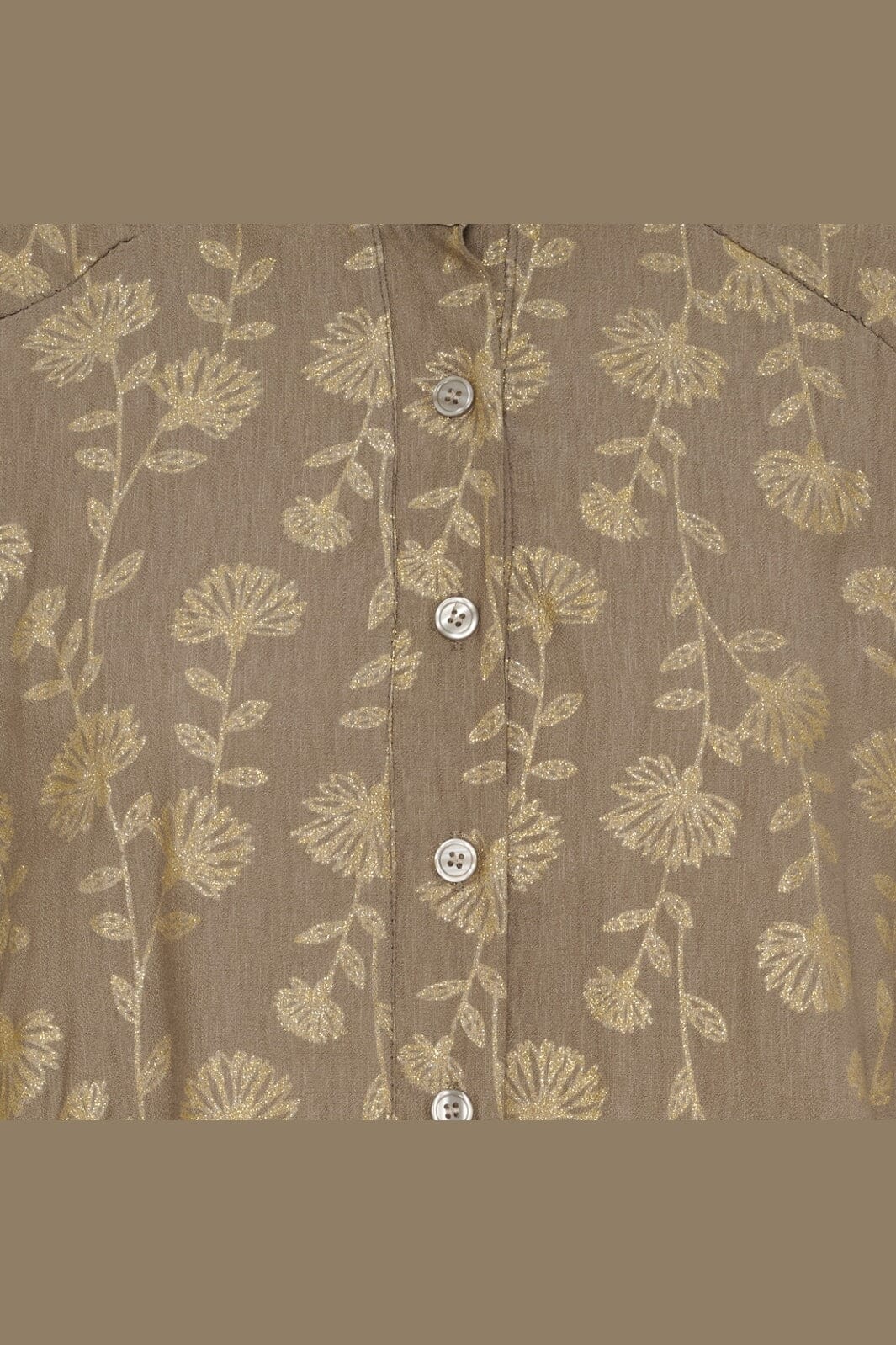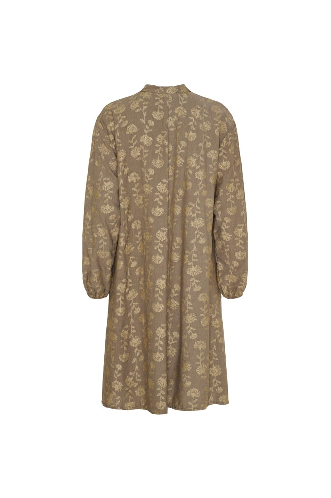 Polven pituinen mekko Marta Du Chateau:lta ruskeana kultaisella kukkakuviolla. Mekossa on pitkät hihat, joissa on elastaania, ja läpi menevä nappilukko pienen kauluksen kanssa.
