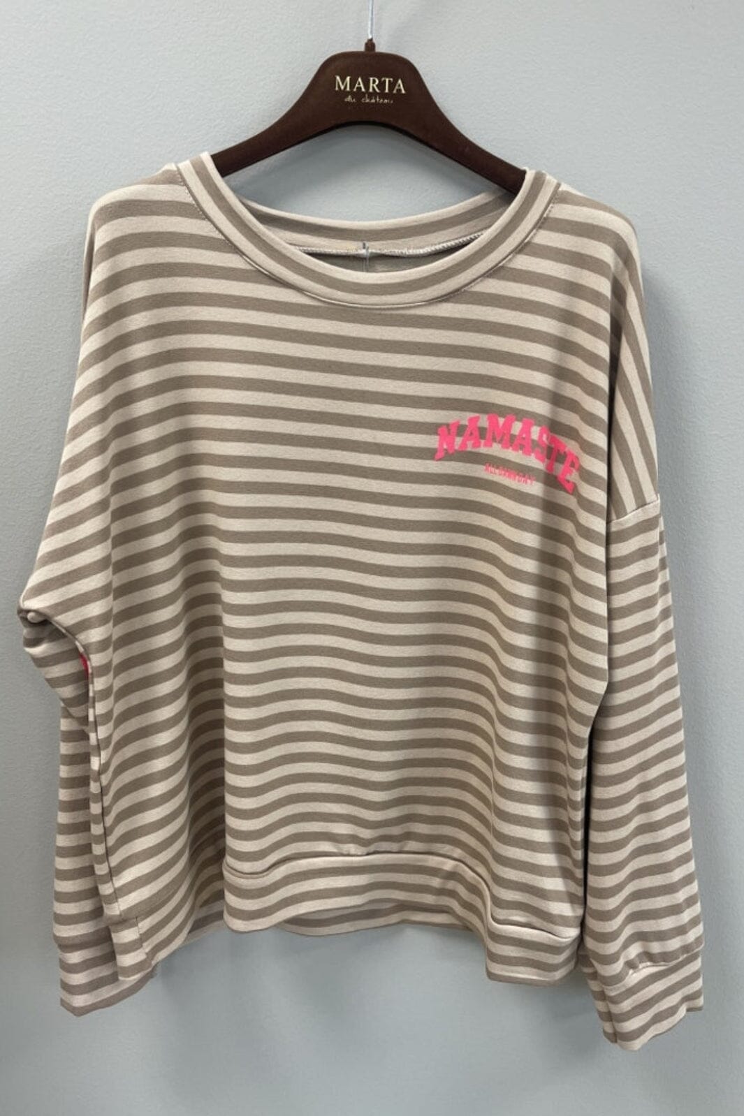 Beige raidallinen pusero Marta Du Chateaulta, valmistettu puuvillasta ja elastaanista. Puserossa on vaakasuuntaiset beigen ja valkoisen sävyiset raidat sekä pinkki NAMASTE-teksti edessä.
