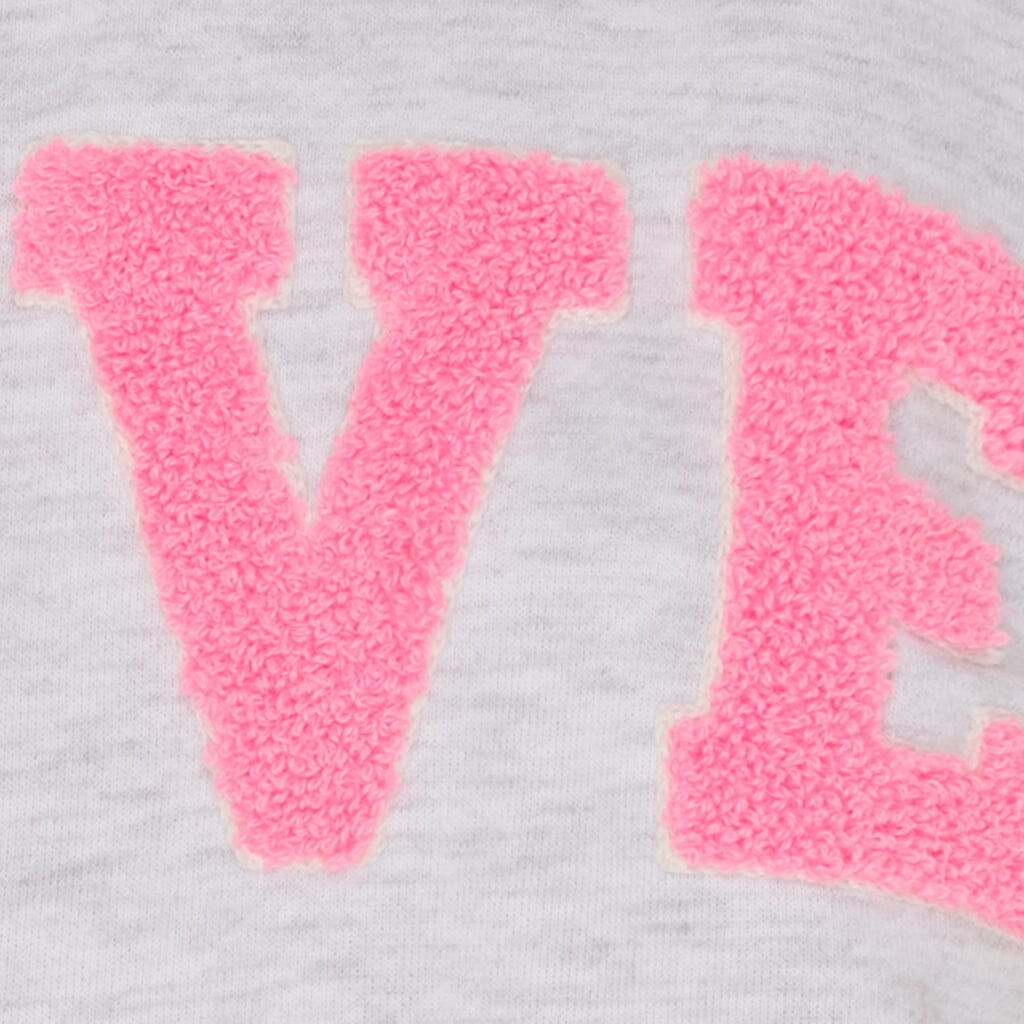 Vaaleanharmaa Marta Du Chateau -collegepaita, jossa on vaaleanpunainen LOVE-kirjailu edessä. Collegepaidassa on meleerattu pinta ja rento istuvuus.