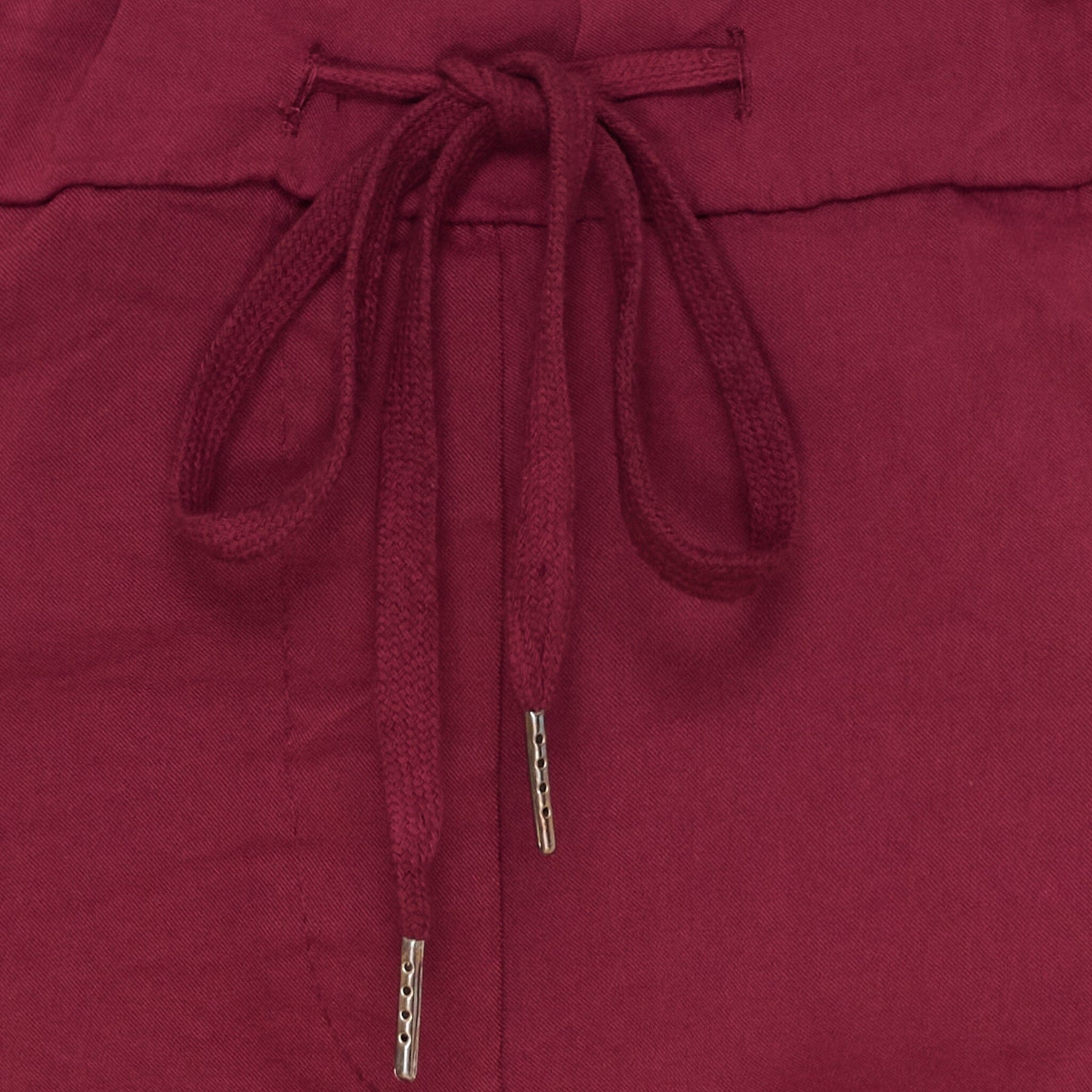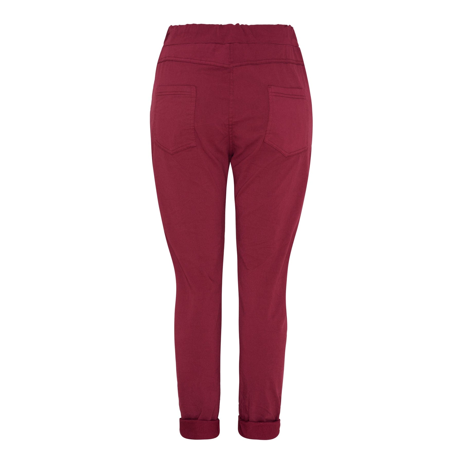 Bordeaux-väriset housut Marta Du Chateau -merkillä, joissa on nauha vyötäröllä. Housuissa on säännöllinen istuvuus ja kaksi etutaskua. Ne ovat nilkkapituudet käännetyillä lahkeilla.
