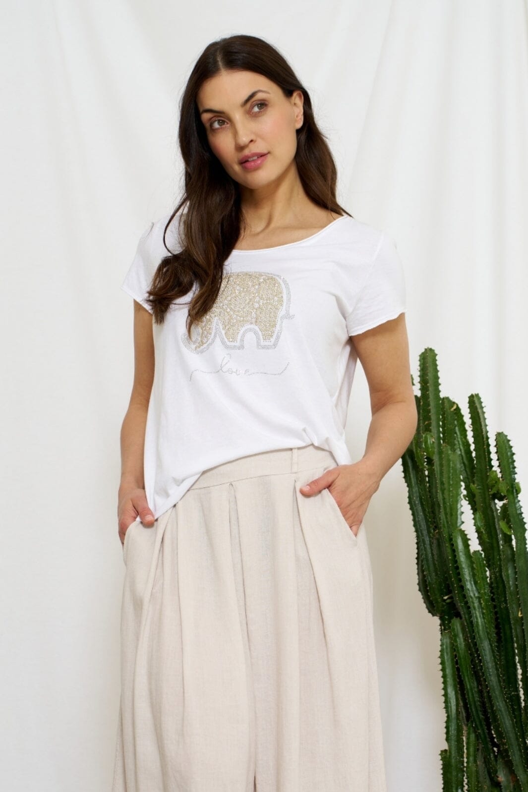 Valkoinen t-paita Marta Du Chateau -merkiltä, jossa on koristeellinen norsumotiivi kullassa ja hopeassa. Pyöreä kaula-aukko ja lyhyet hihat antavat t-paidalle yksinkertaisen ja rentouttavan tyylin.