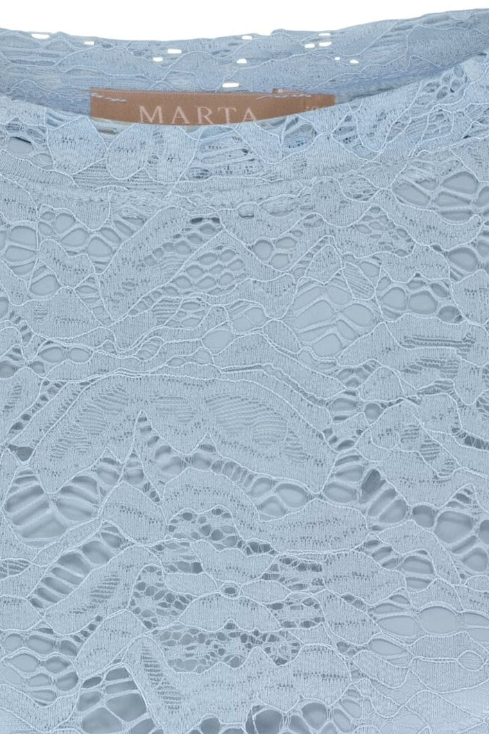 Vaaleansininen pitsipusero Marta du Châteaulta. Pusero on päälle puettava malli ilman suljentaa ja siinä on yksityiskohtainen pitsikuvio koko pinnalla.