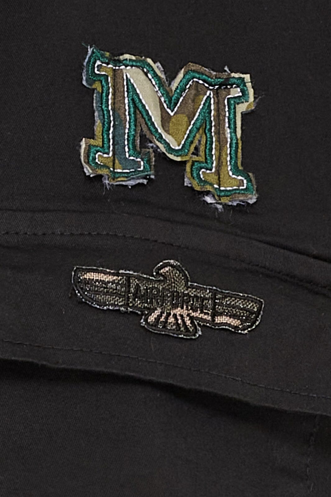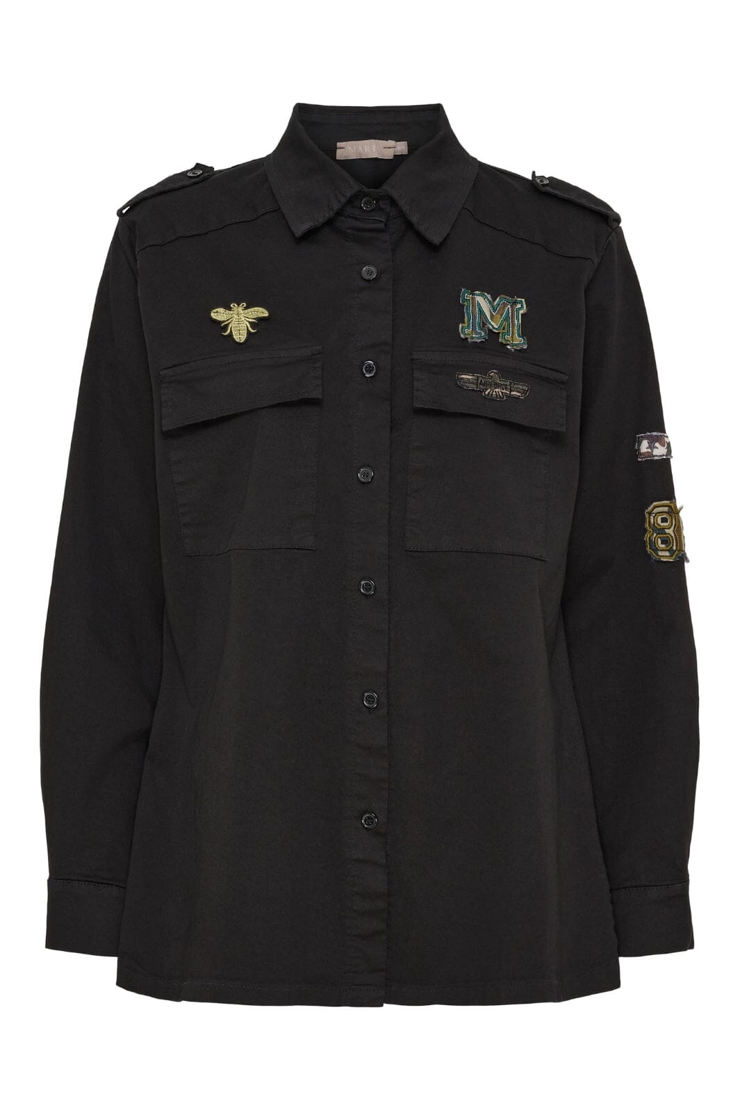 Marta Du Chateau -mustajakku, jossa on kauluspaita ja napit. Siinä on brodeerattuja päällysteitä, joissa on mehiläinen ja M-logo, sekä koristeelliset olkapäät, jotka antavat sotilaallisen ilmeen.