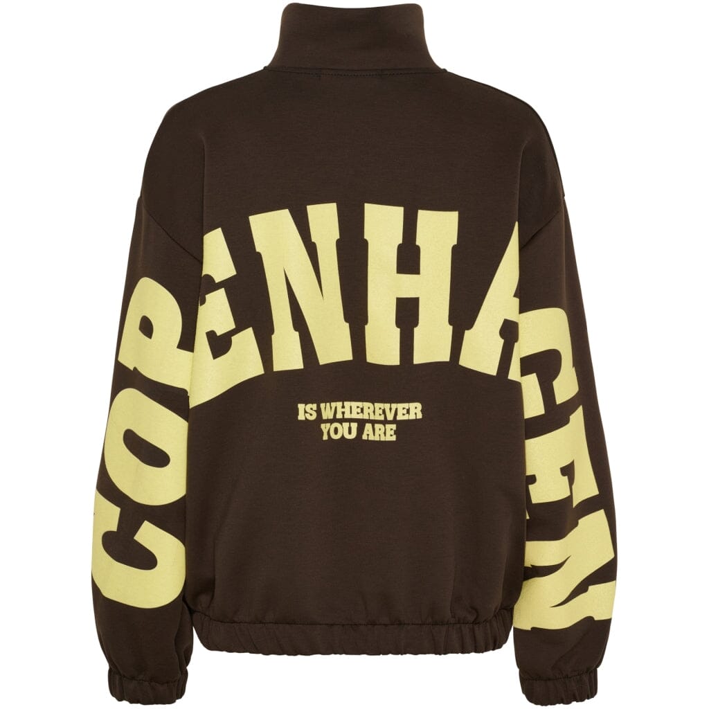 Tummanruskea neuletakki Marta Du Chateaulta, keltaisilla yksityiskohdilla. Neuletakissa on vetoketju edessä ja joustavat hihansuut. Se sopii sekä rennon arjen hetkiin että aktiiviseen menoon.