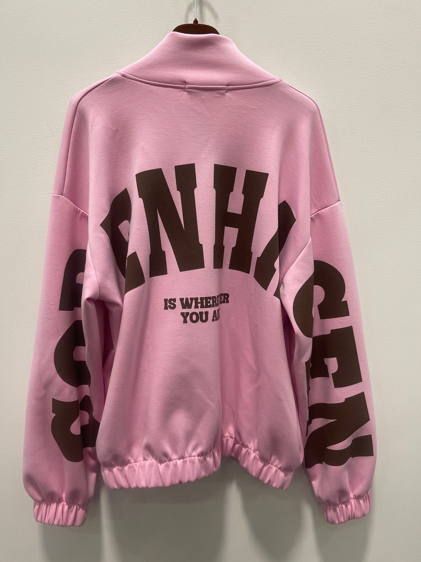 Vaaleanpunainen neuletakki Marta Du Chateaulta ruskealla tekstipainatuksella. Neuletakissa on korkea kaulus ja vetoketju edessä vaaleanpunaisen ja ruskean väriyhdistelmässä.