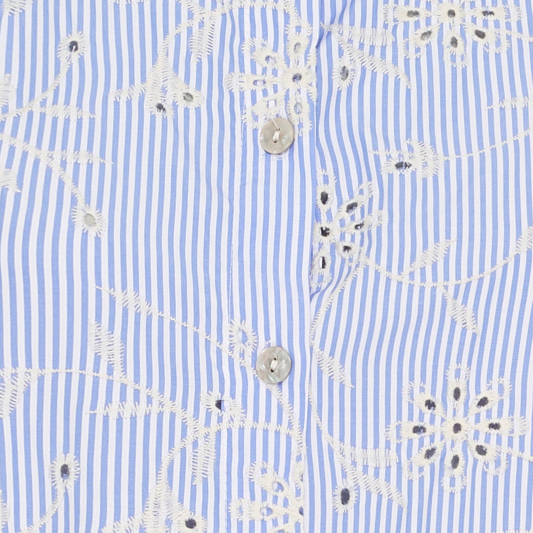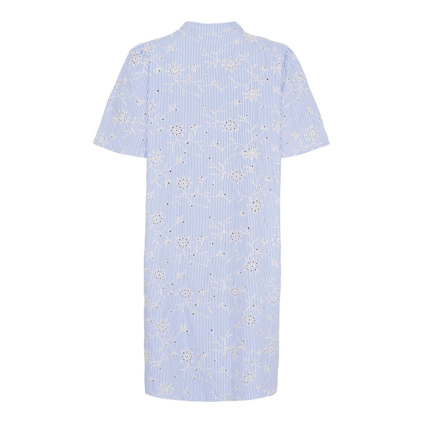 Polven pituinen mekko Marta Du Chateau:lta vaaleansinisena valkoisilla raidoilla. Mekossa on kauluspaita, nappilukko edessä ja lyhyet hihat. Kukka-ompelu luo kauniin vuorovaikutuksen raitojen kanssa.