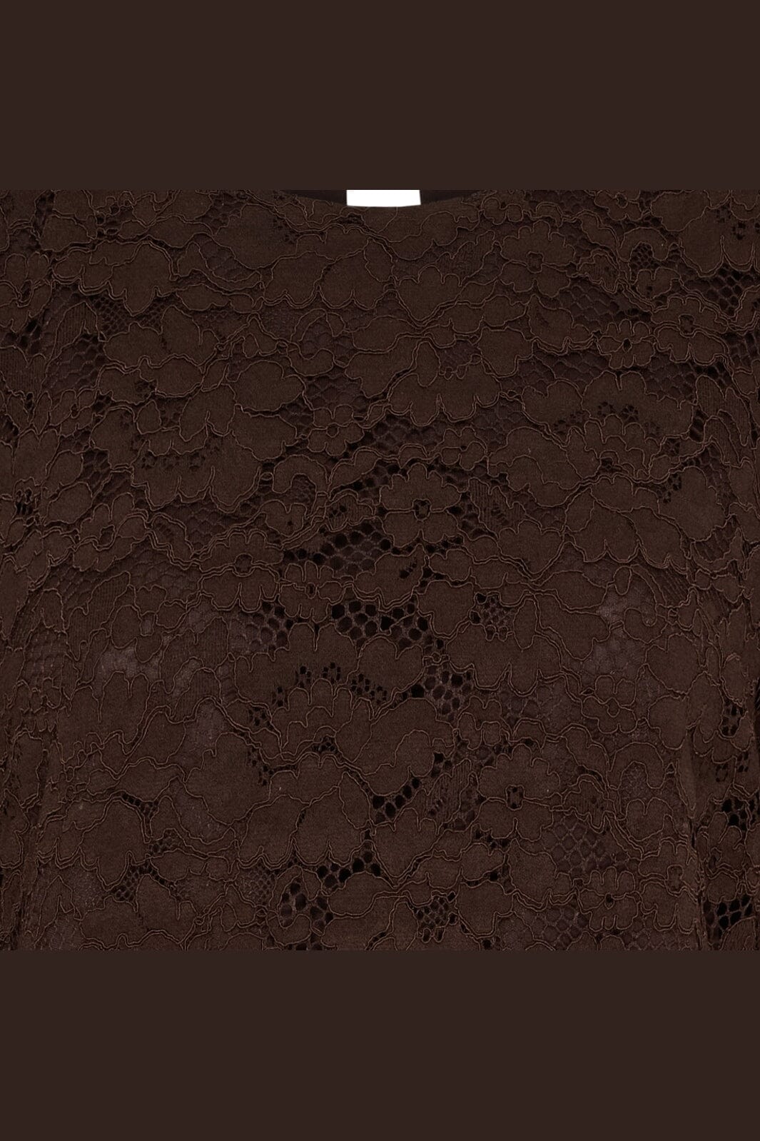 Ruskea pitsimekko Marta Du Chateau -merkkiltä kukkakuviolla. Mekossa on lyhyet hihat, pyöreä kaula-aukko ja se ulottuu reiteen. Takana oleva nappikiinnitys tekee sen pukemisesta ja riisumisesta helppoa.