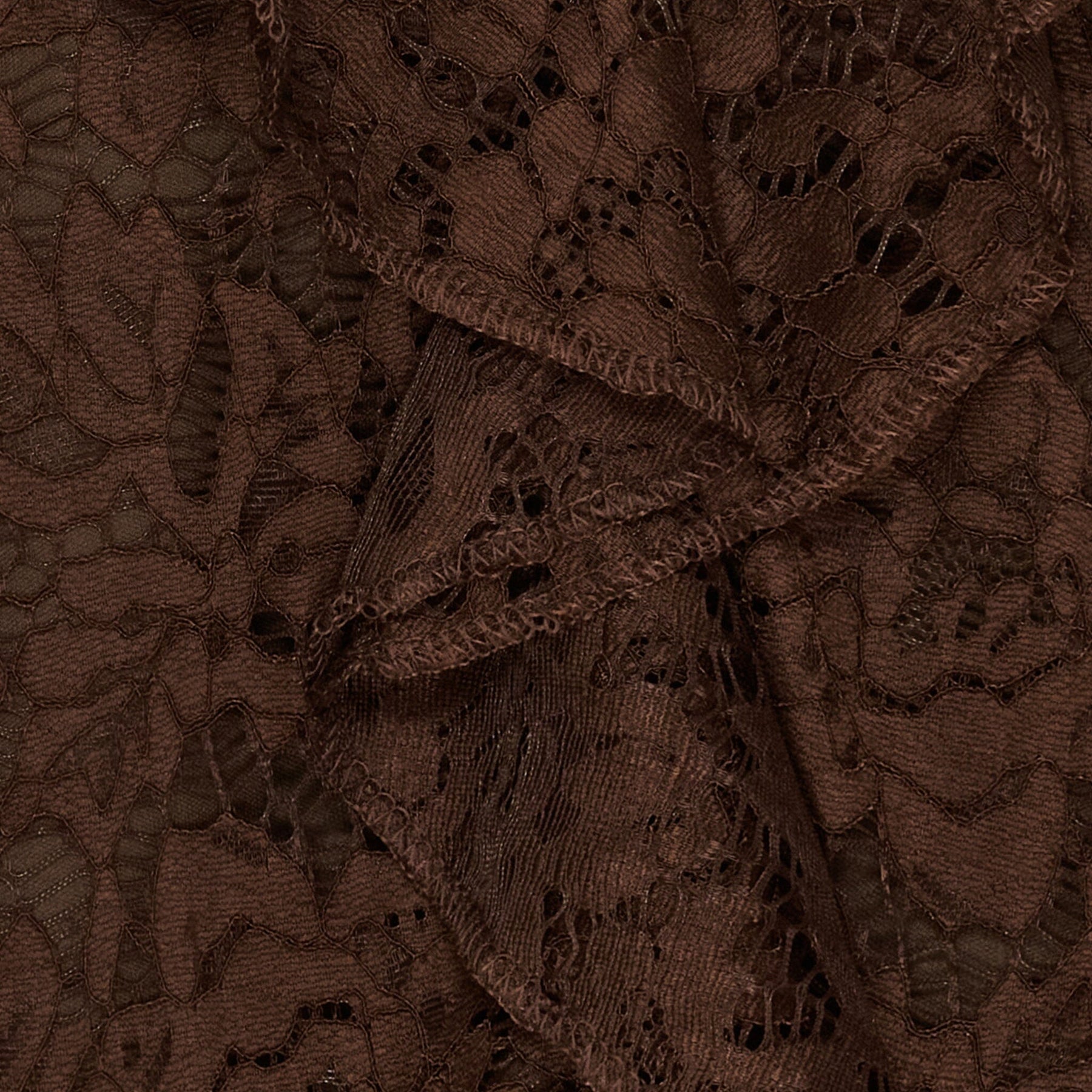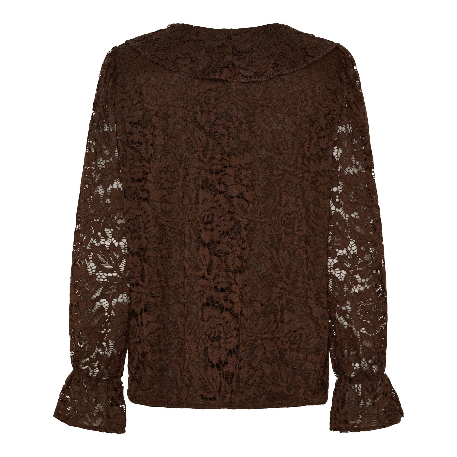 Ruskea pitsipaita Marta Du Chateau'lta, jossa on kukkakuosi ja röyhelöyksityiskohtia. Paita sopii sekä muodollisiin että rentoihin tilaisuuksiin sekä juhliin.