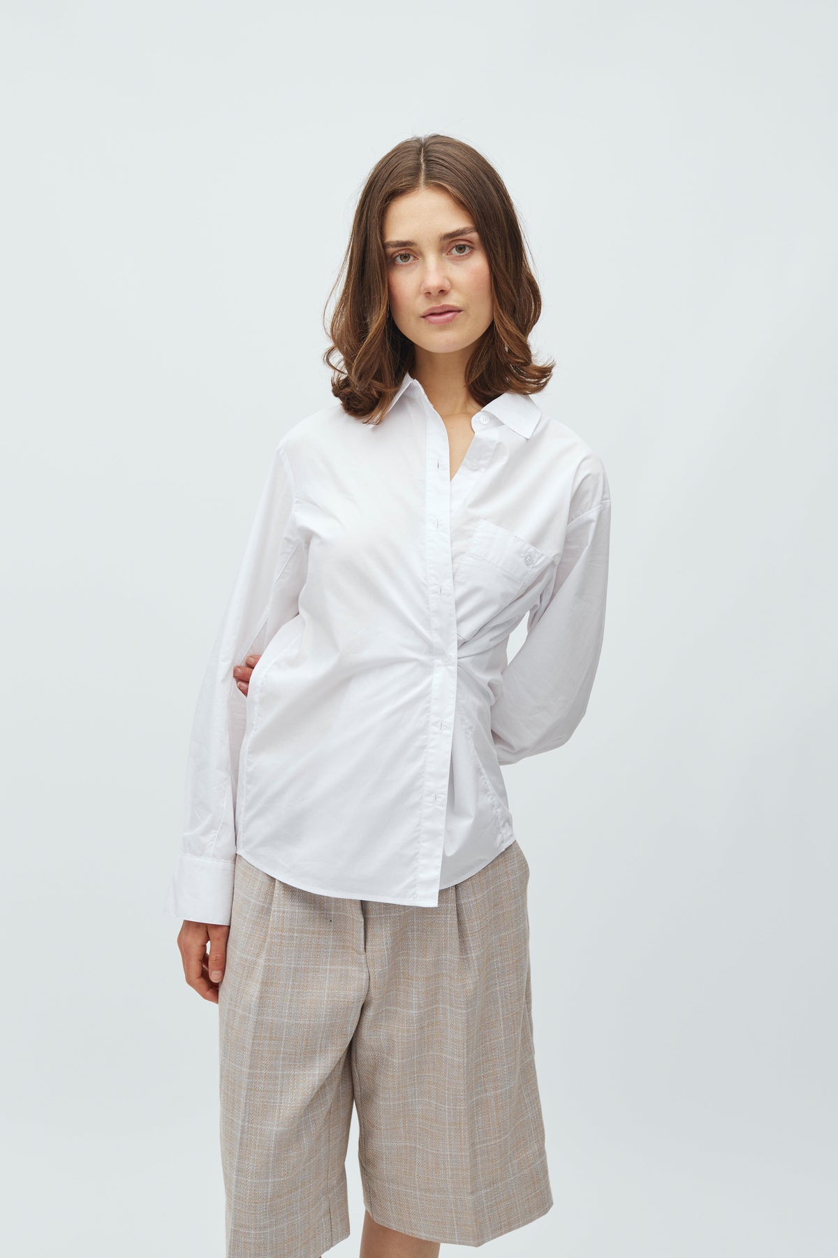 Valkoinen MbyM-paita, valmistettu 100 % puuvillasta. Paidassa on pitkät hihat, kauluspaita-kaulus ja nappikiinnitys, ja se sopii sekä muodollisiin että rennompaan käyttöön.