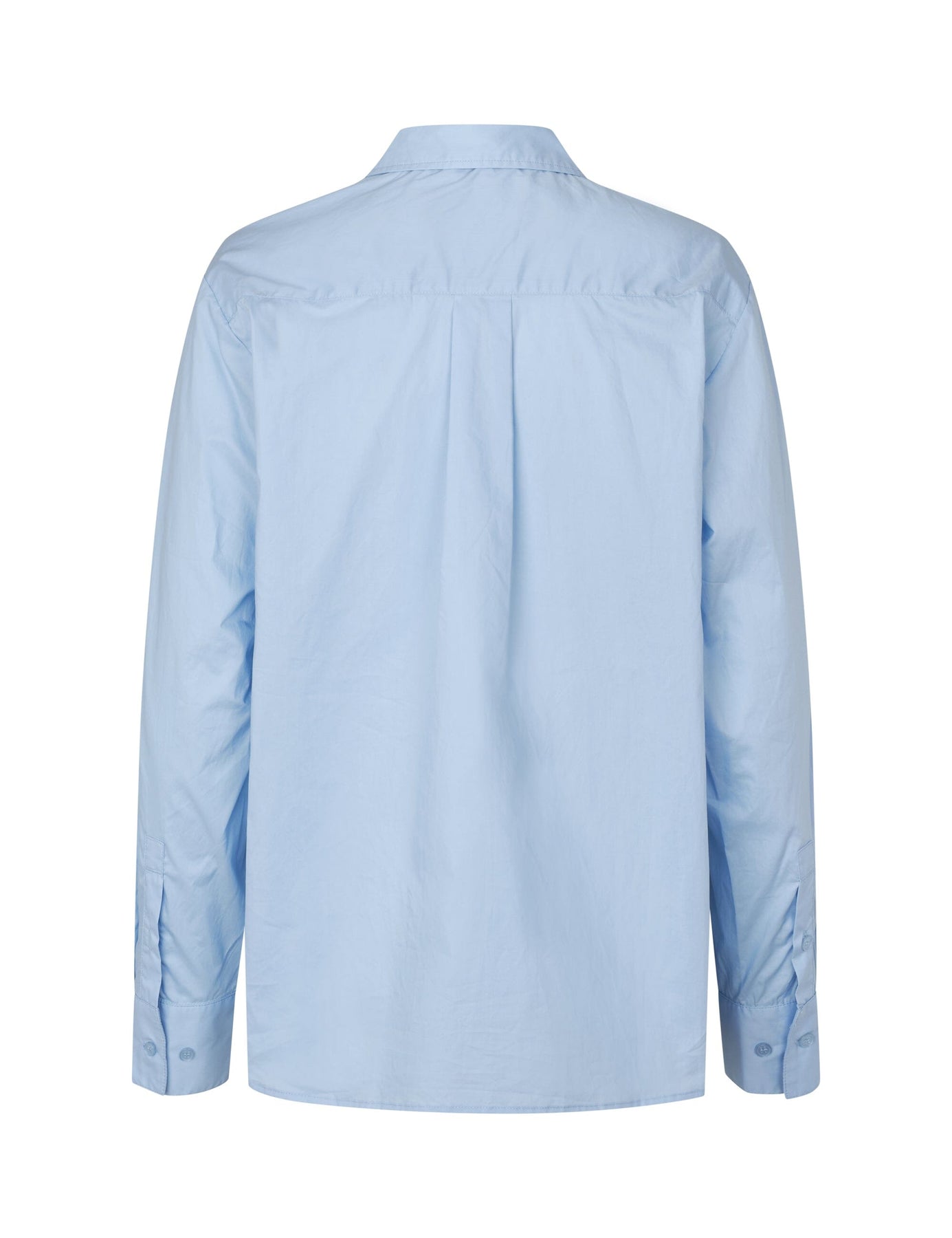 Vaaleansininen MbyM-paita, valmistettu 100 % puuvillasta. Paidassa on väljä istuvuus, pitkät hihat ja nappikiinnitys edessä.