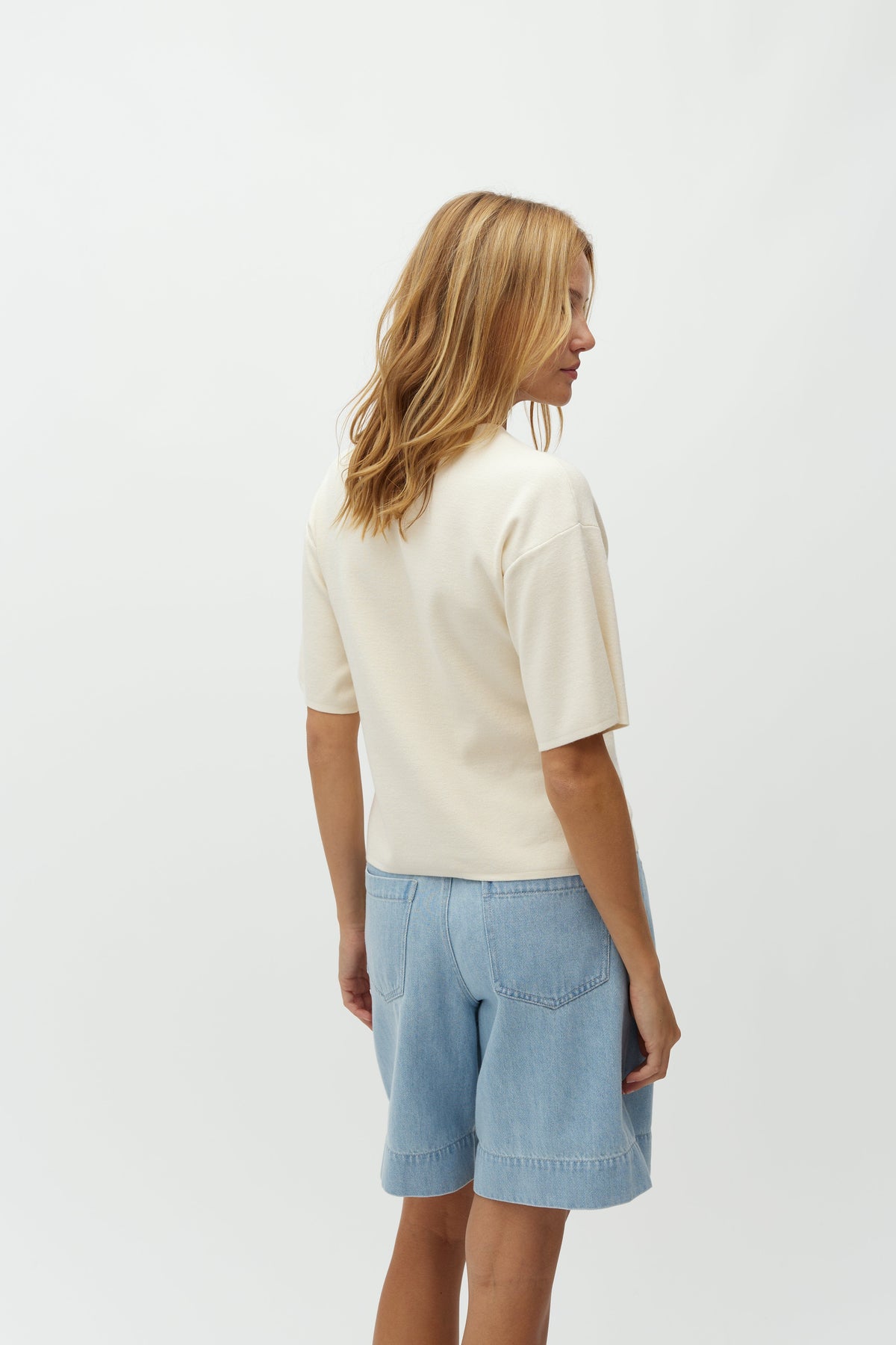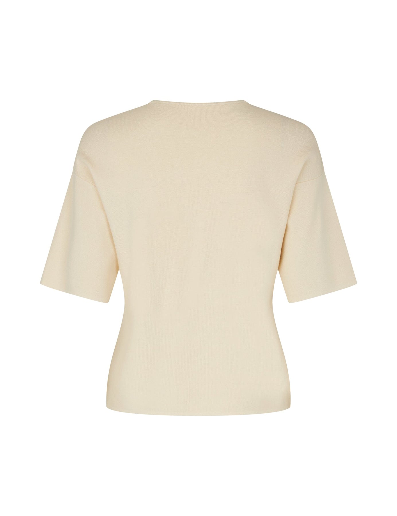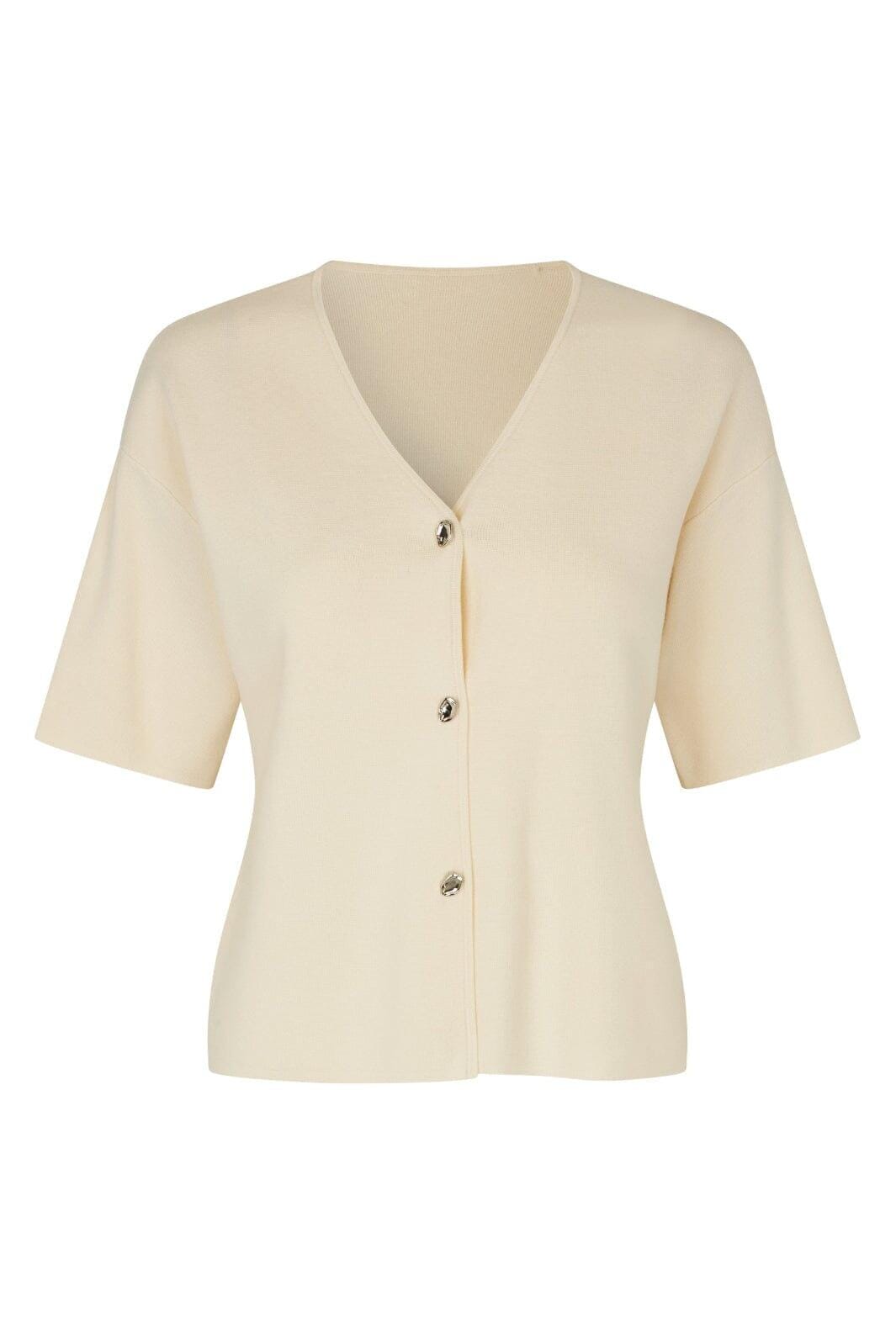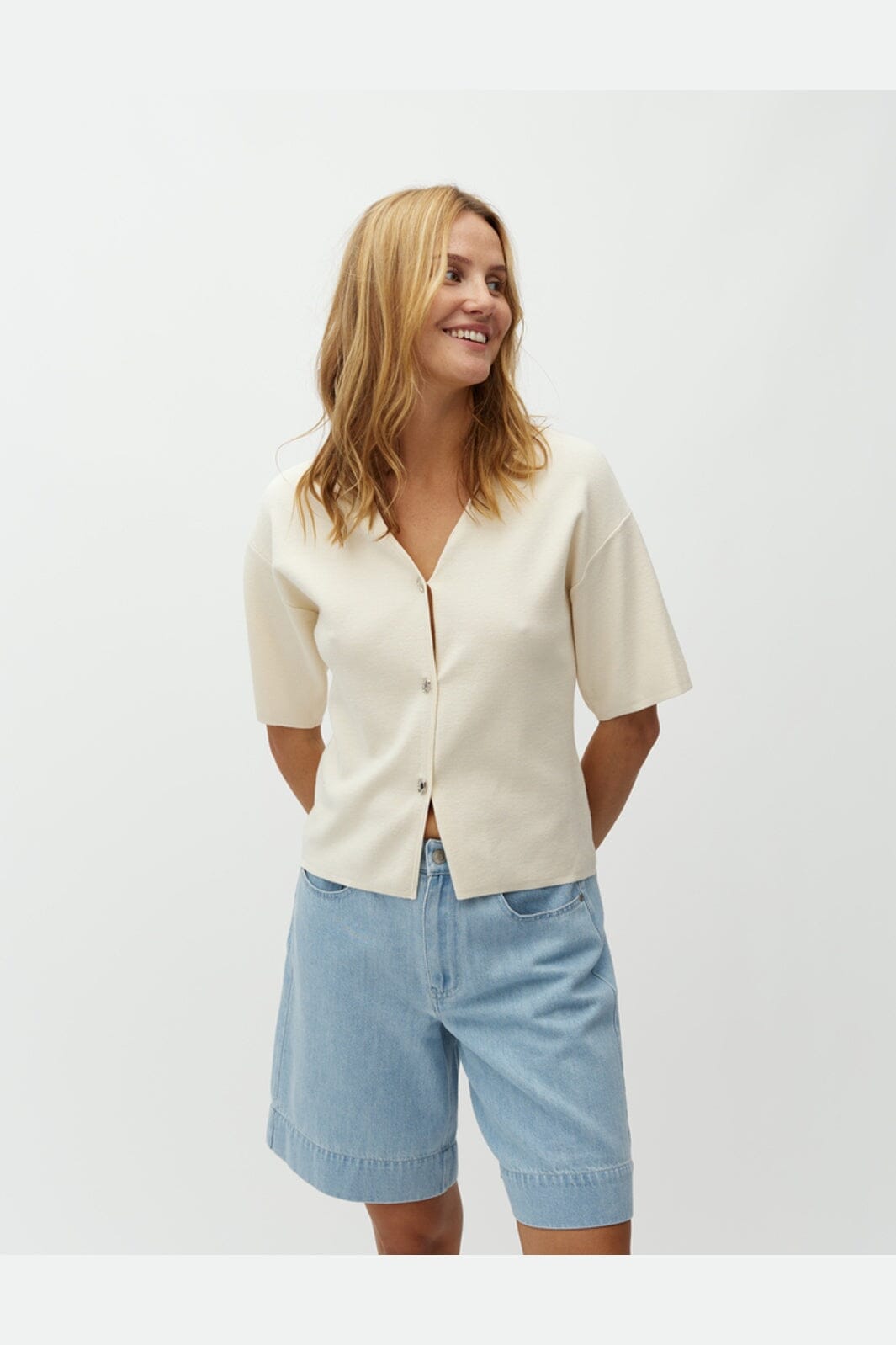 Kermanvärinen MbyM-toppi, jossa on lyhyet hihat ja napit edessä. Topissa on V-pääntie ja se on tarkoitettu jokapäiväiseen käyttöön.