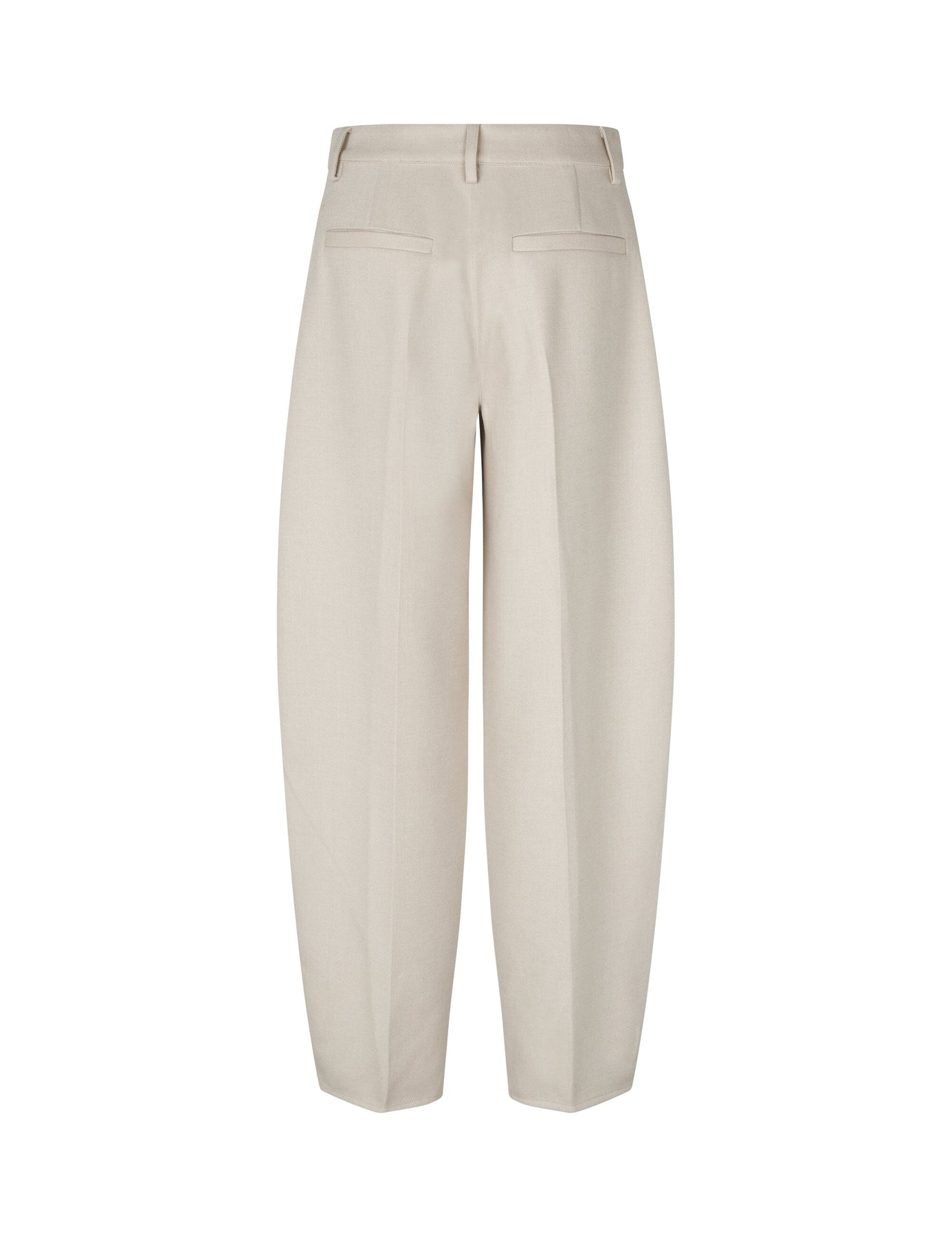 Väljät housut MbyM:ltä ruskean meleeratun sävyisinä. Housut on valmistettu 70 % polyesteristä ja 30 % viskoosista, ja niissä on korkea vyötärö sekä nilkkapituus.