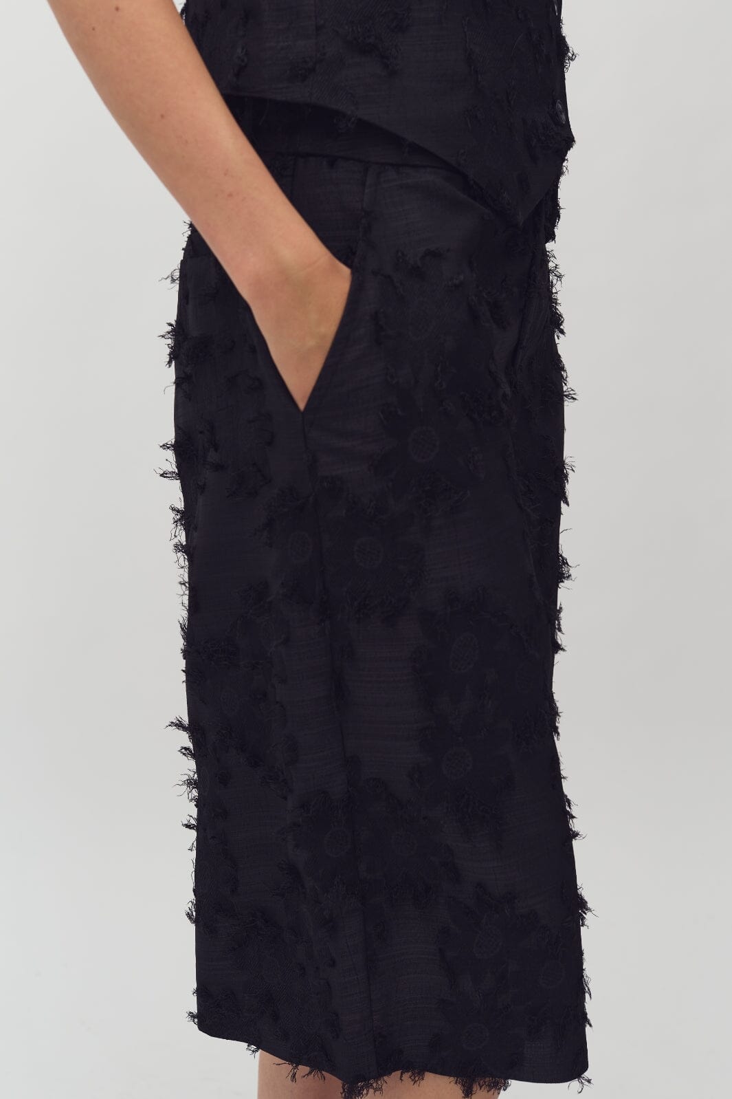 MbyM:n mustat shortsit, joissa on rakenteellinen muotoilu ja kukkakuosi. Shortseissa on polvipituus ja ne on varustettu sekä vetoketjulla että napilla vyötäröllä.