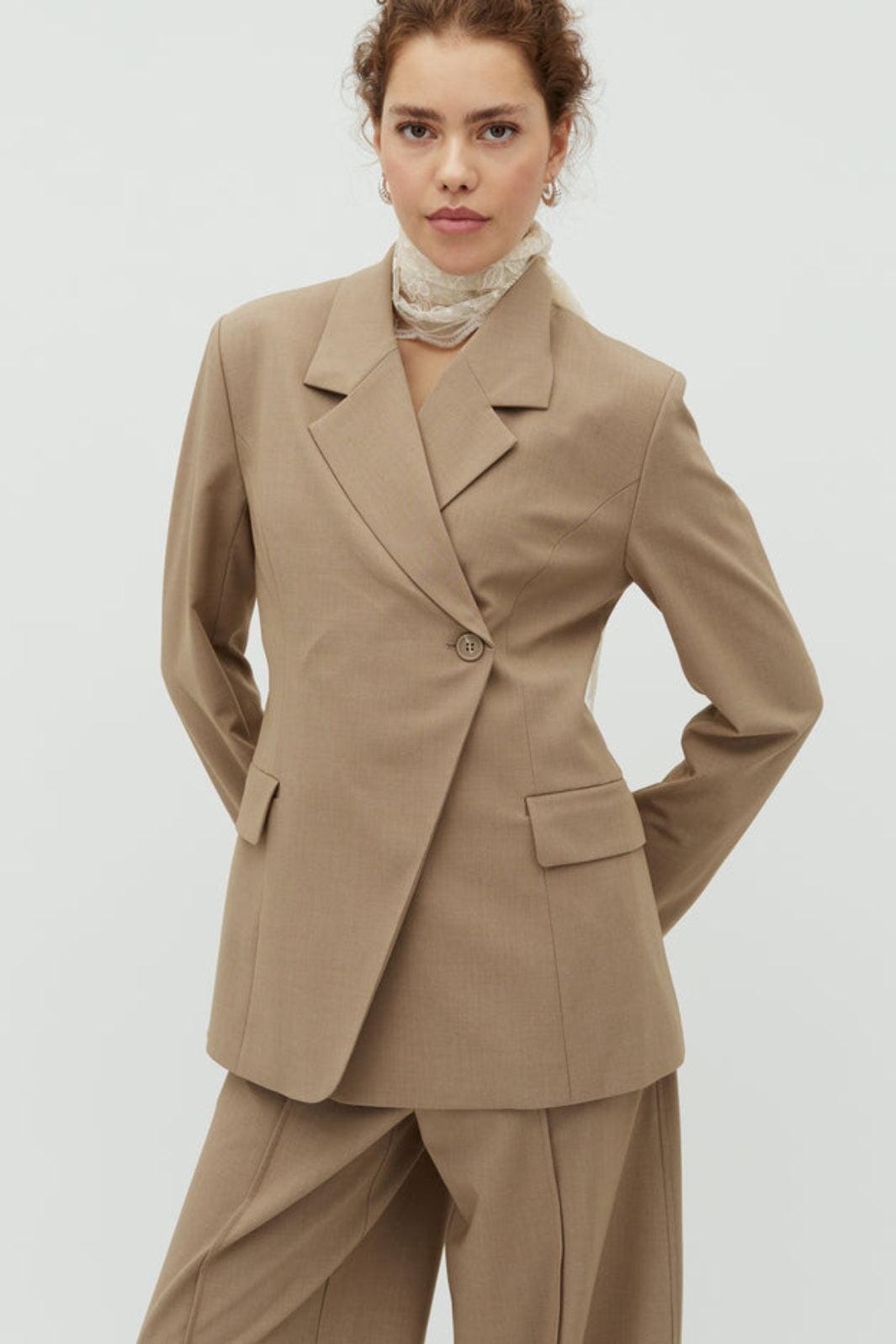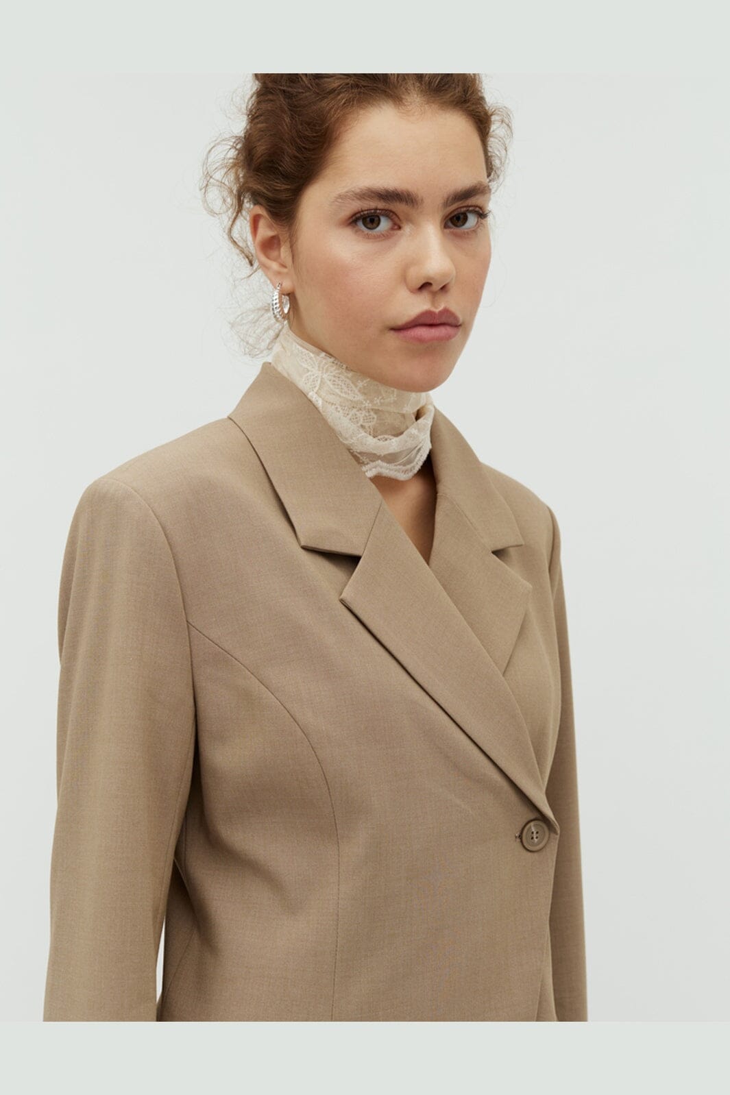 Bleiseri MbyM:ltä vaaleanruskeassa meleeratun sävyssä. Bleiserissä on pitkät hihat, V-pääntie ja nappikiinnitys.
