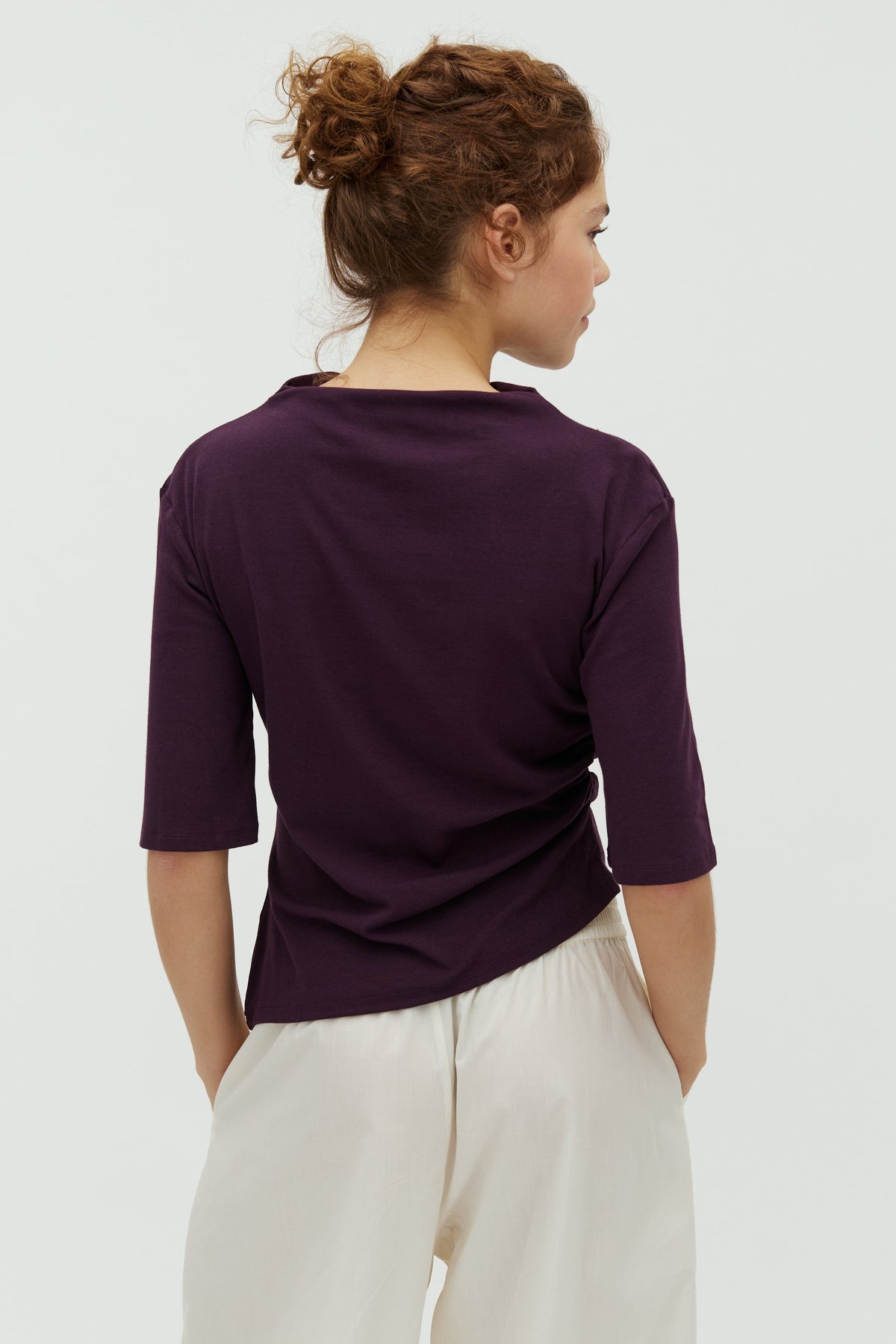 Violetti paita MbyM:ltä, jossa on kolmen neljänneksen hihat ja epäsymmetrinen helma. Paidassa on kevyt rypytys sivussa.