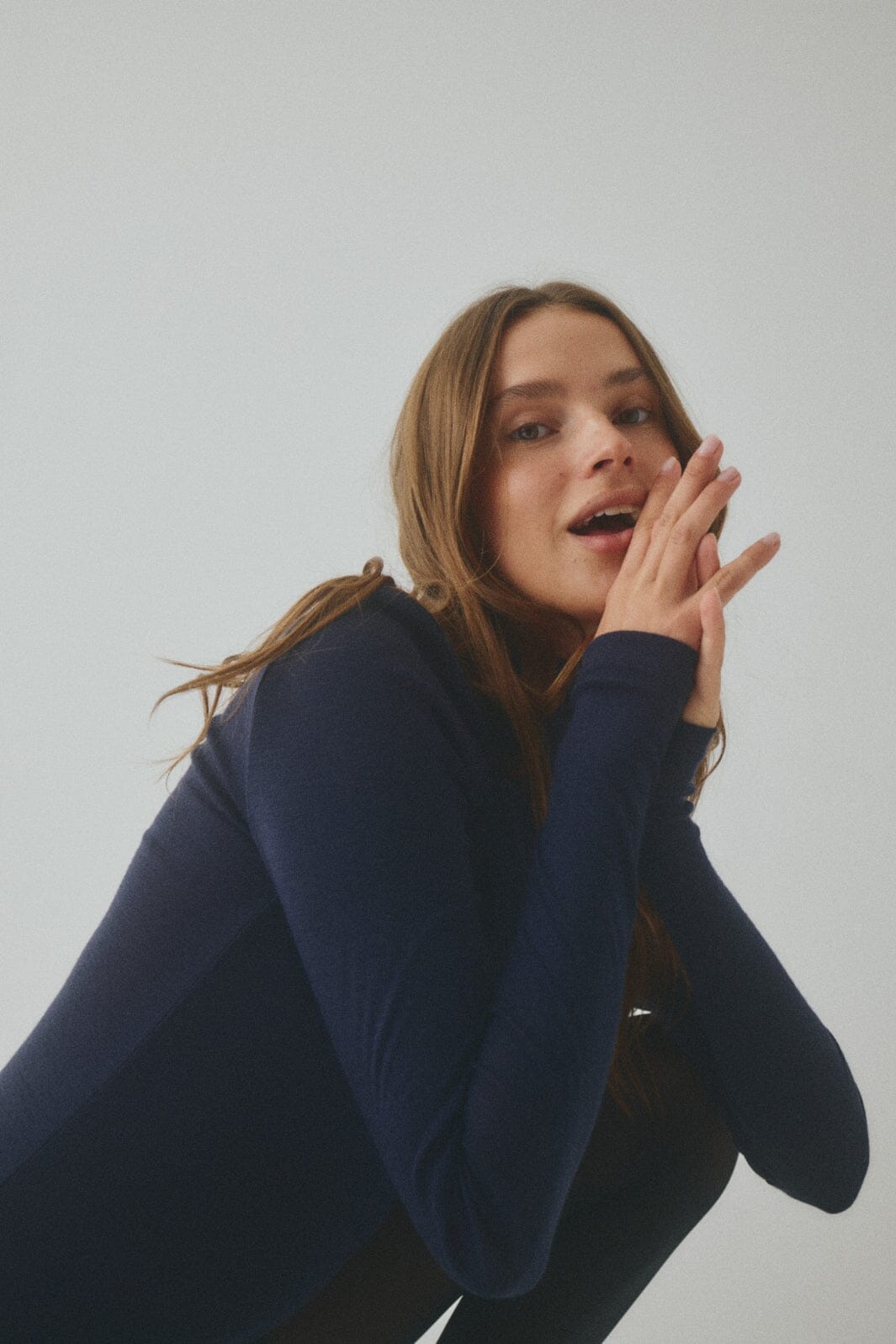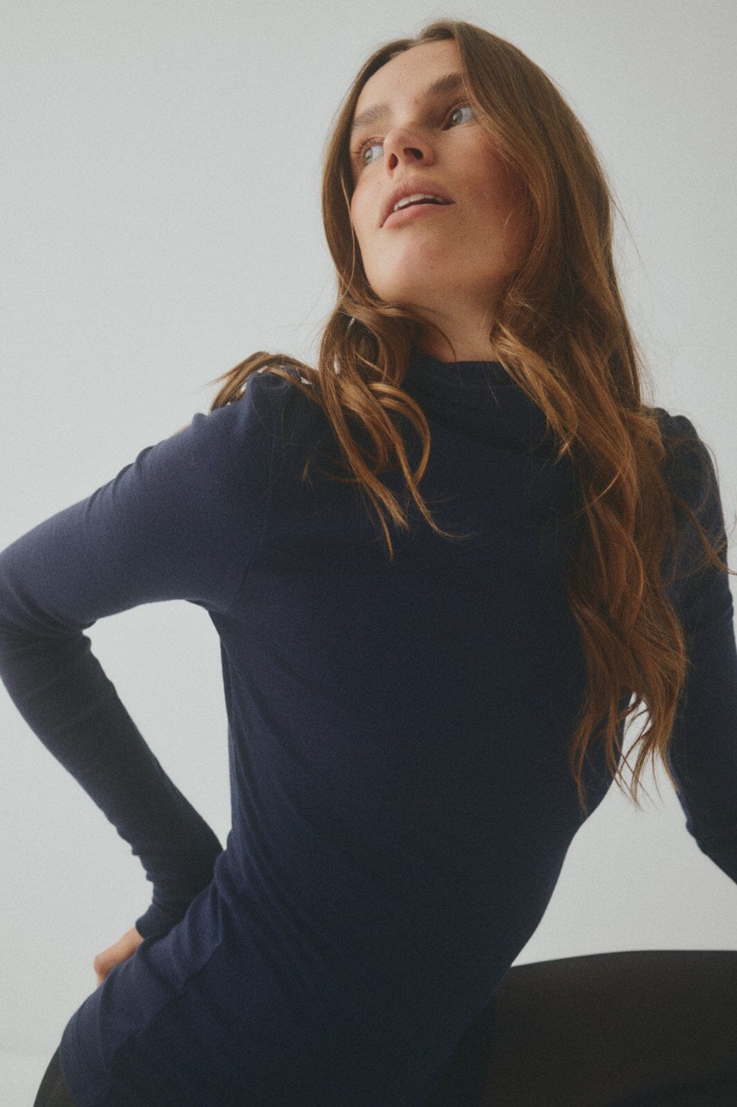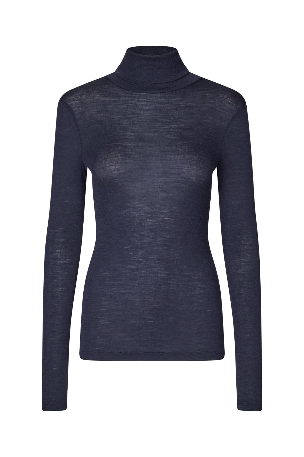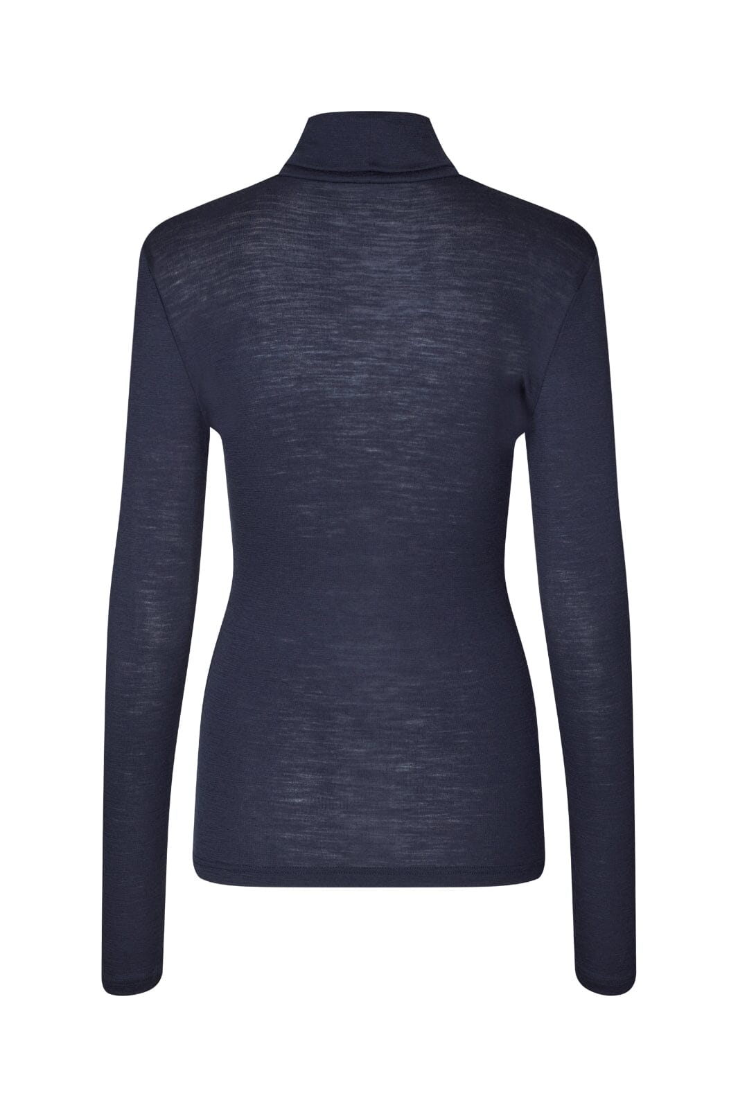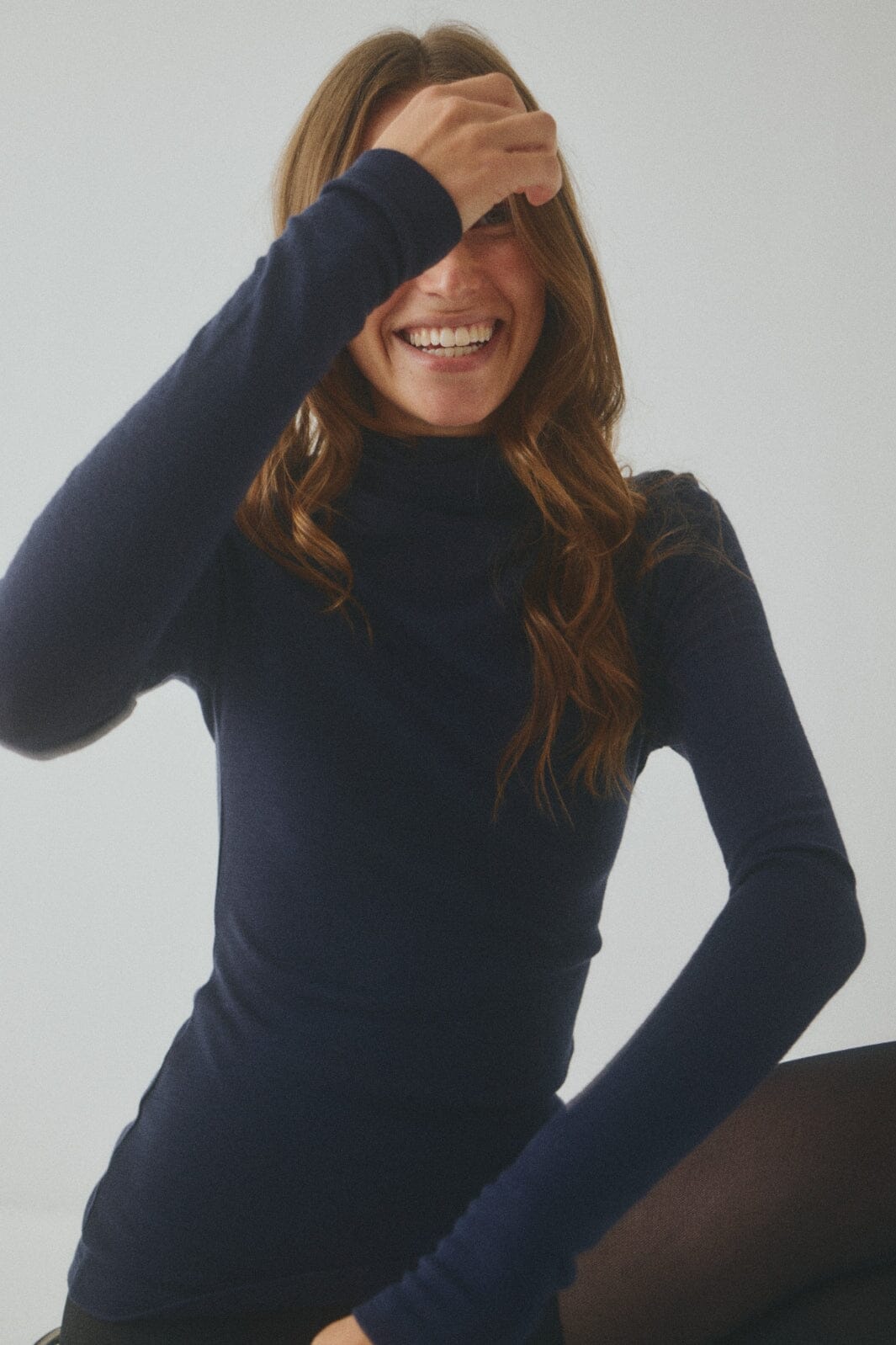 Tummansininen poolopaita MbyM:ltä merinovillasta. Paita, jossa on korkea kaulus ja pitkät hihat, yhdistää klassisen muotoilun käytännölliseen mukavuuteen.