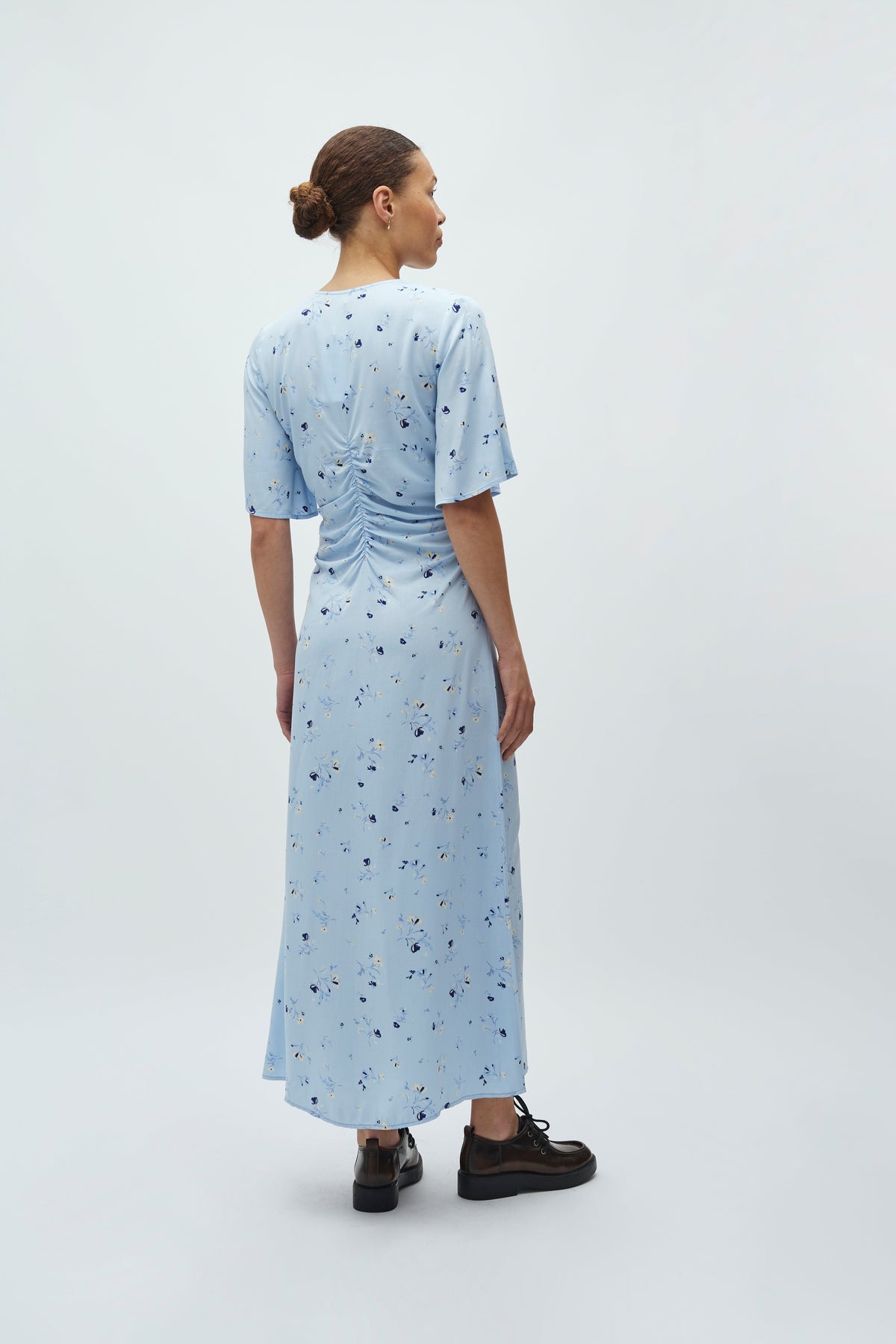 MbyM-mekko vaaleansinisessä sävyssä kukkakuosilla. Mekossa on lyhyet hihat ja V-pääntie.