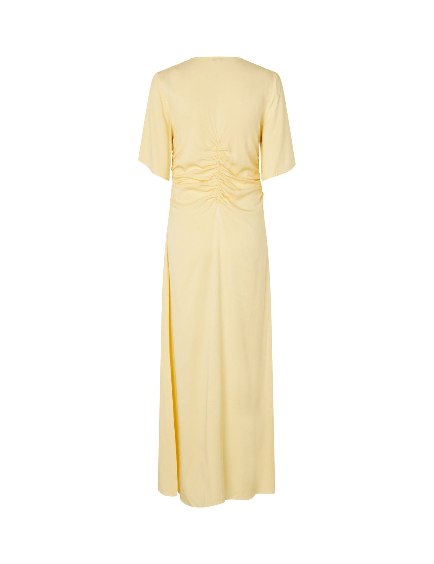 Keltainen mekko MbyM:ltä värissä Summer Yellow. Mekossa on rypytetyt yksityiskohdat ja V-pääntie.