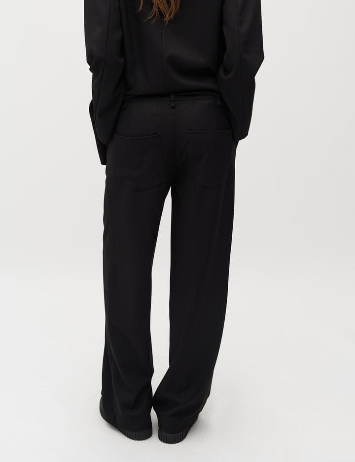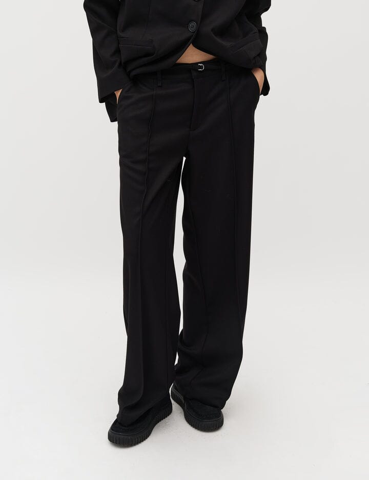MbyM:n mustat housut, joissa on koristeelliset saumat ja vyötäröyksityiskohdat. Housuissa on leveä lahkeensuu ja lattialle ulottuva pituus, ja ne sopivat sekä rentoihin että muodollisiin tilaisuuksiin.