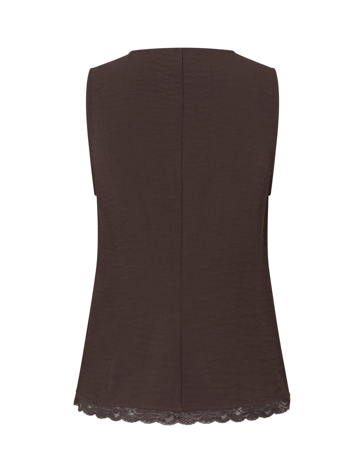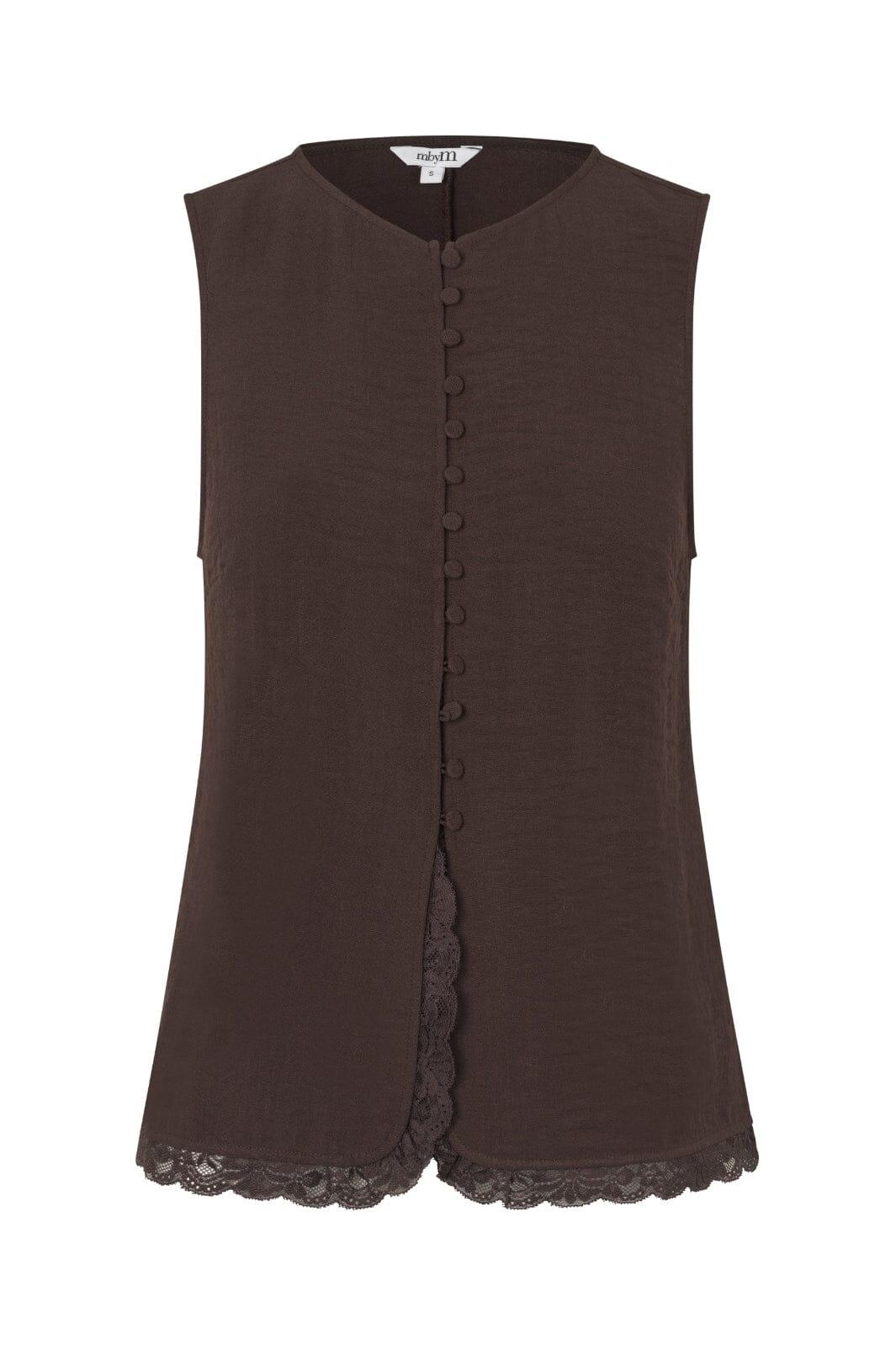 Hihaton toppi MbyM:ltä tummanruskeassa värissä. Topissa on pyöreä pääntie ja nappikiinnitys edessä kangaspäällysteisillä napeilla.
