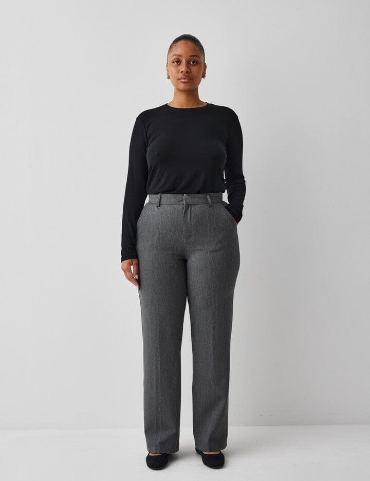 Harmaat housut MbyM:ltä melange-kankaasta. Housuissa on suora malli ja nilkkapituus etutaskuilla. Kankaassa on neutraali melange-rakenne.