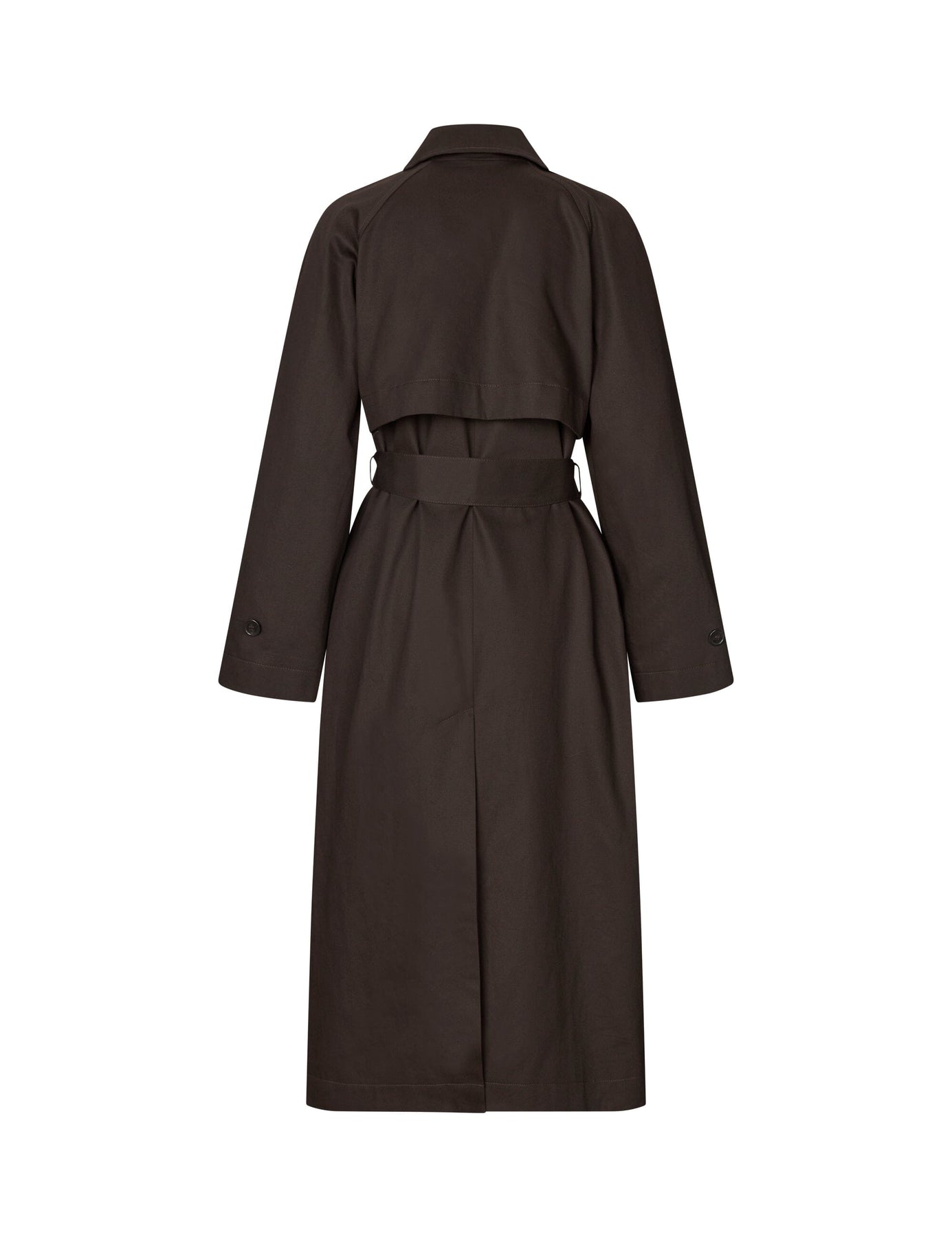 MbyM-trenssitakki, valmistettu 100 % puuvillasta tummanruskeassa sävyssä. Takissa on kaksirivinen malli ja solmittava vyö vyötäröllä.